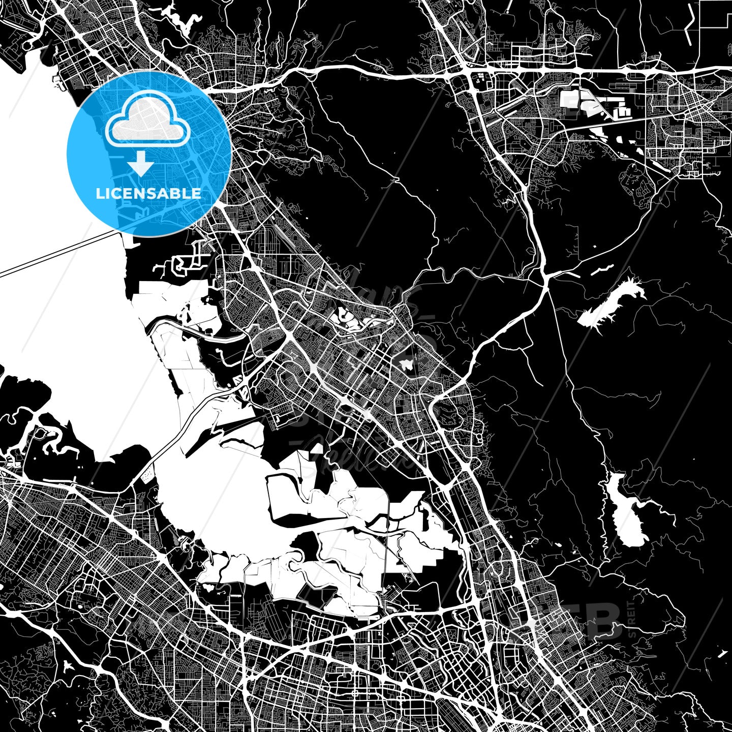 Fremont, USA, area map in black and white version with many details for high zoom levels. This map of Fremont contains typical landmarks for traffic with space for additional information and easy access to color changes.