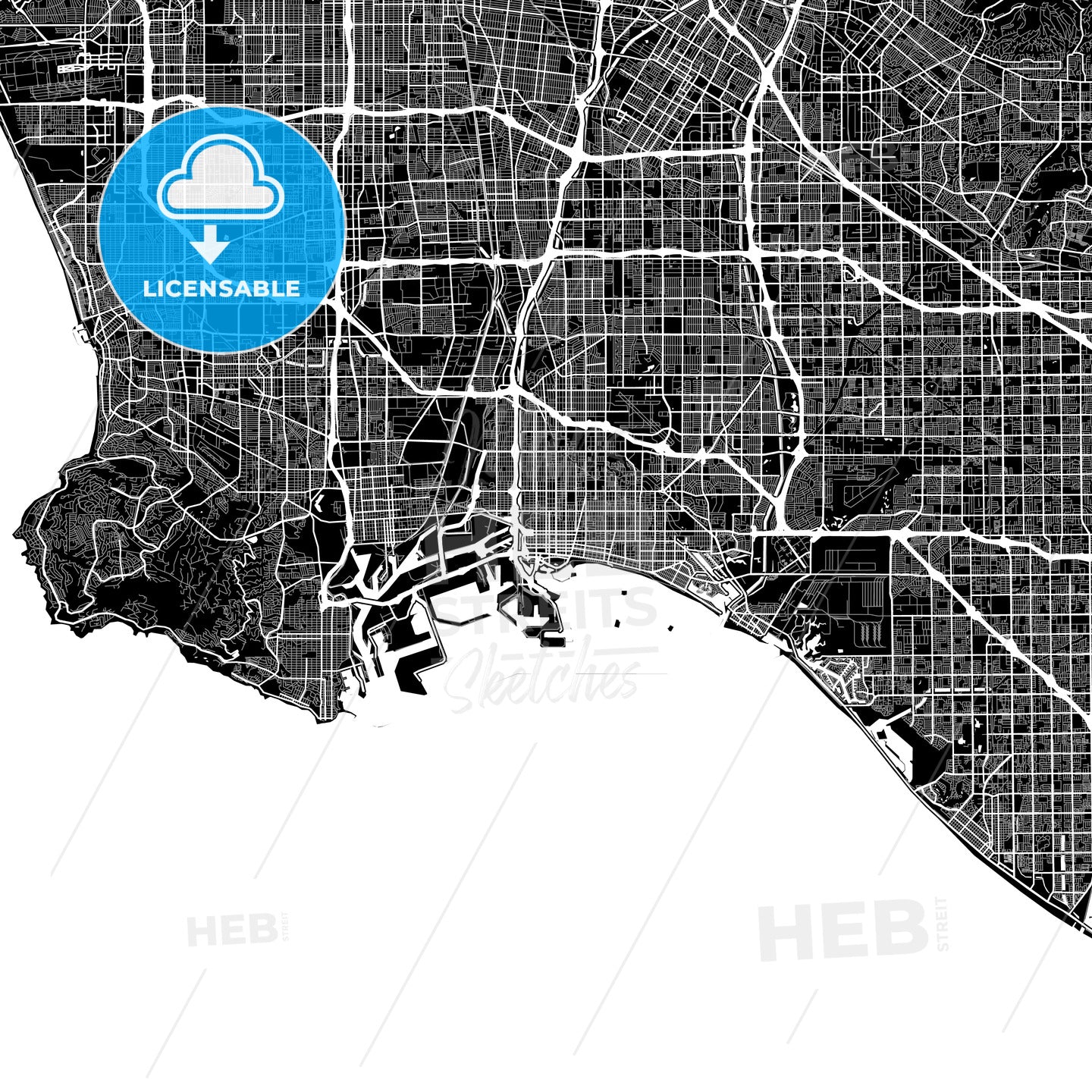 Long Beach, USA, area map in black and white version with many details for high zoom levels. This map of Long Beach contains typical landmarks for traffic with space for additional information and easy access to color changes.