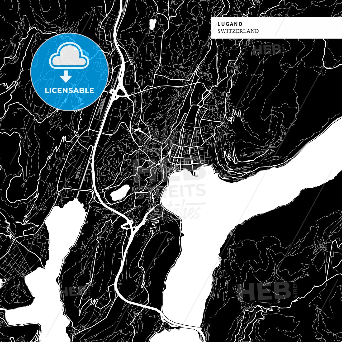 Area map of Lugano, Switzerland with typical urban landmarks like buildings, roads, waterways and railways as well as smaller streets and park trails. Removable city label placed on top.