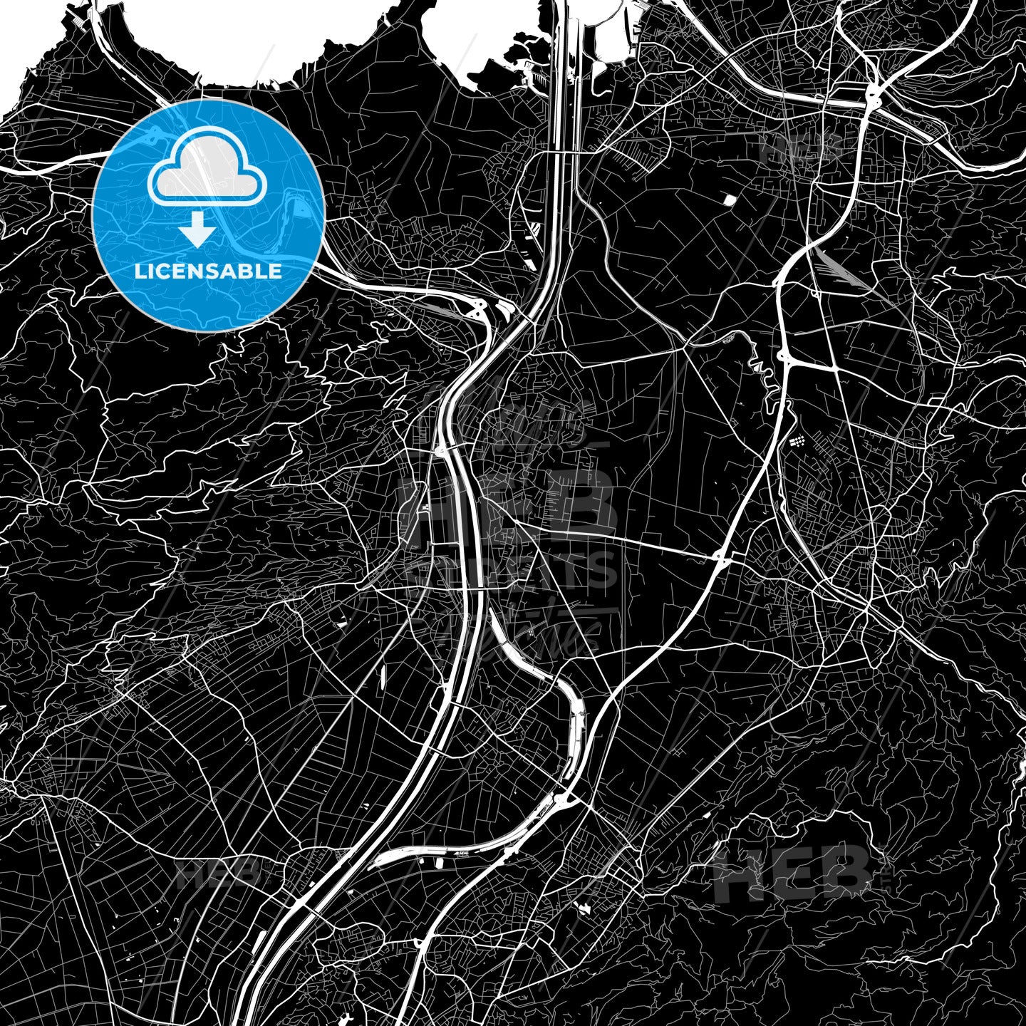 Area map of Lustenau, Austria. Dark background version for infographic and marketing projects. This map of Lustenau, contains typical landmarks with streets, waterways and railways.