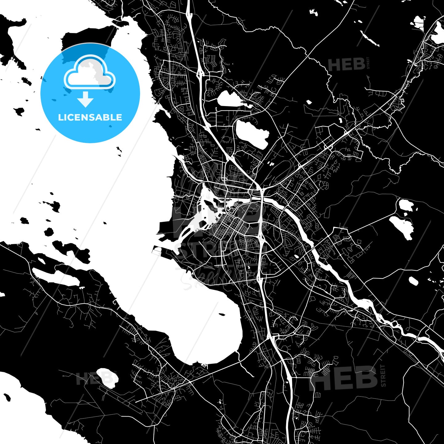 Area map of Oulu, Finland. Dark background version for infographic and marketing projects. This map of Oulu, contains typical landmarks with streets, waterways and railways.