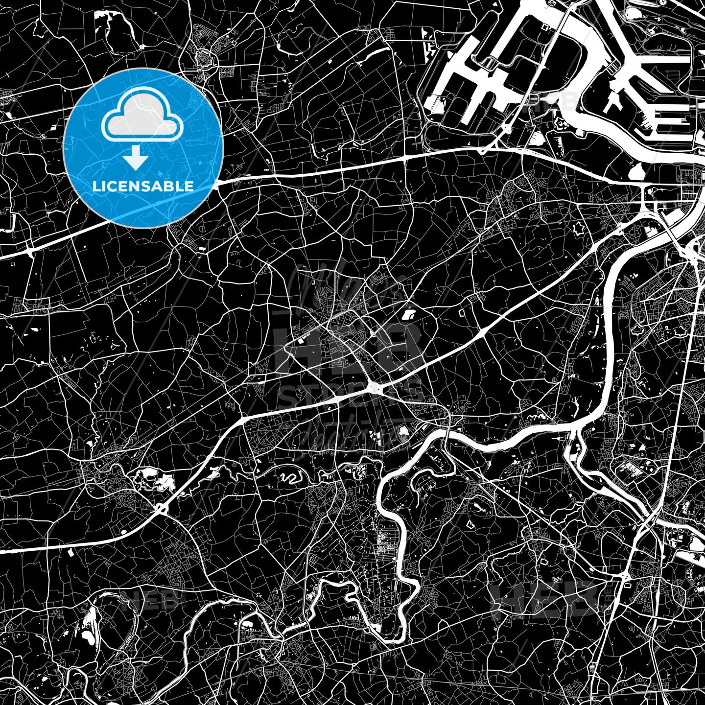 Area map of Sint-Niklaas, Belgium. Dark background version for infographic and marketing. This map of Sint-Niklaas, Flemish Region, contains streets, waterways and railways.