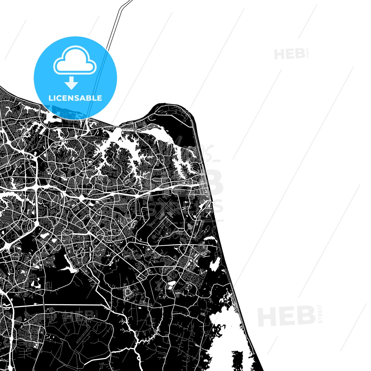 Virginia Beach, USA, area map in black and white version with many details for high zoom levels. This map of Virginia Beach contains typical landmarks for traffic with space for additional information and easy access to color changes.