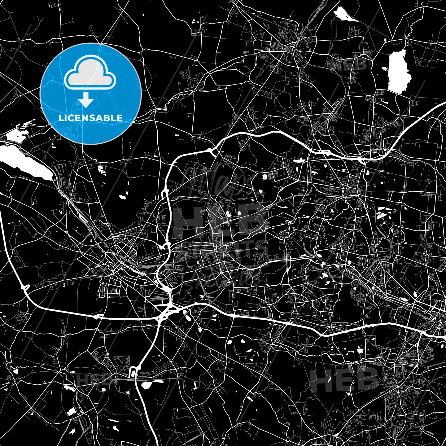 Area map of Zabrze, Poland. Dark background version for infographic and marketing projects. This map of Zabrze contains typical landmarks with streets, waterways and railways.