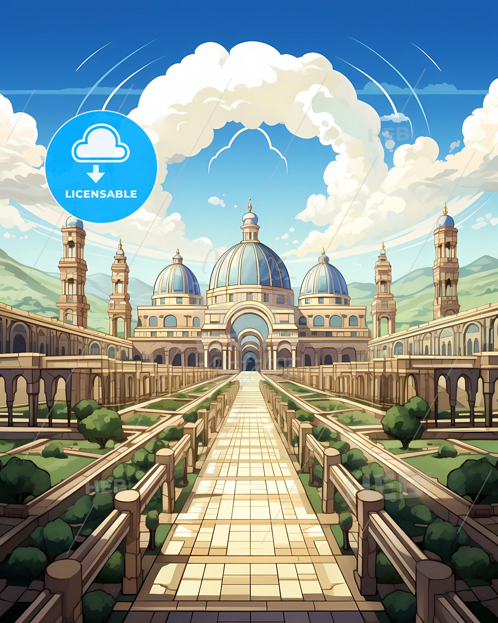 Arequipa Peru Skyline. art painting with blue sky some bright clouds in spring. in style of classic advertising illustration with nice gradients. Nice strokes and outlines. Large area of copy space on top. litte bright sparkles