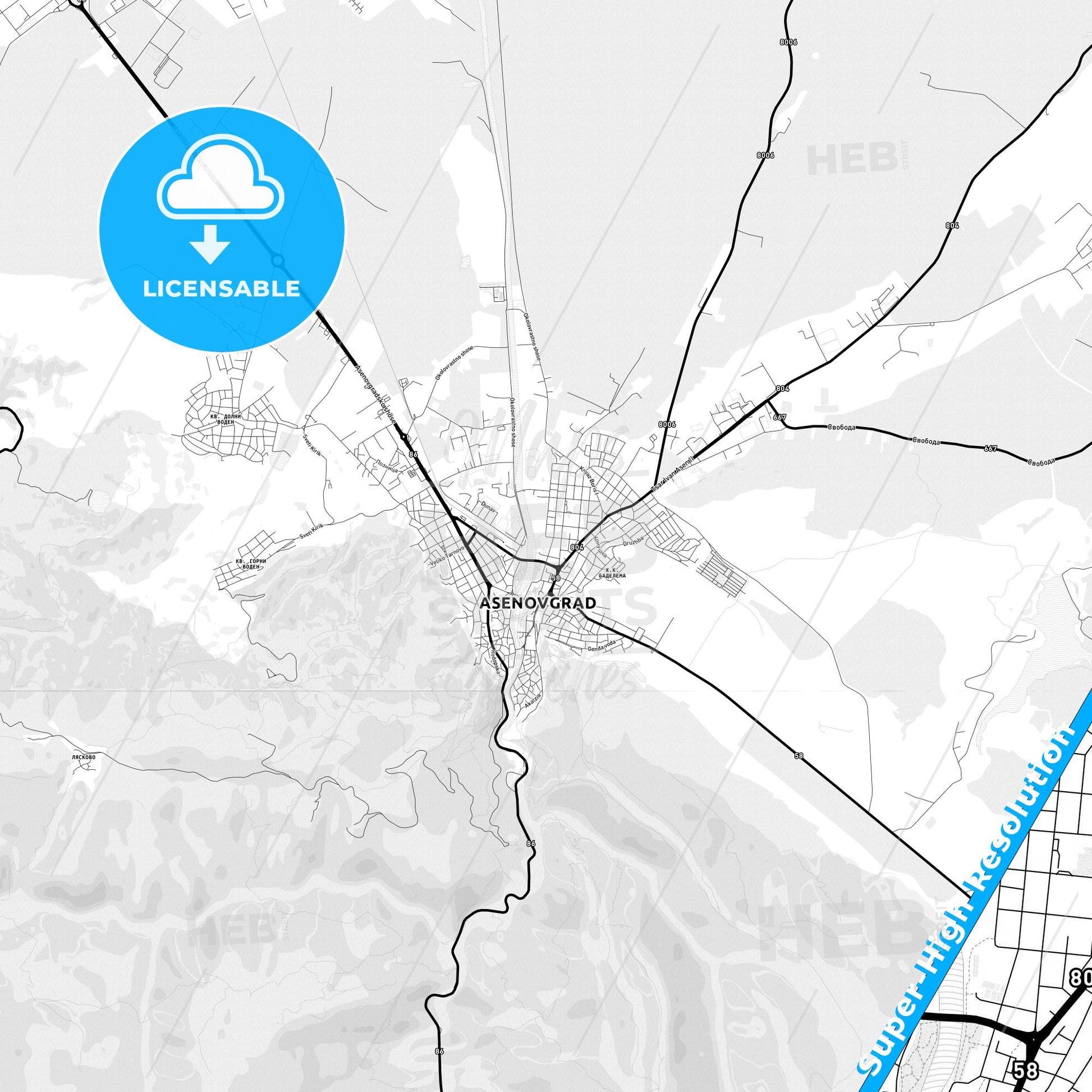 Asenovgrad, Plovdiv Province, Bulgaria in high-resolution, minimalist map designed for printed use. This detailed black and white map accurately highlights the street network and urban layout, making it an ideal ready-to-use map for your business.