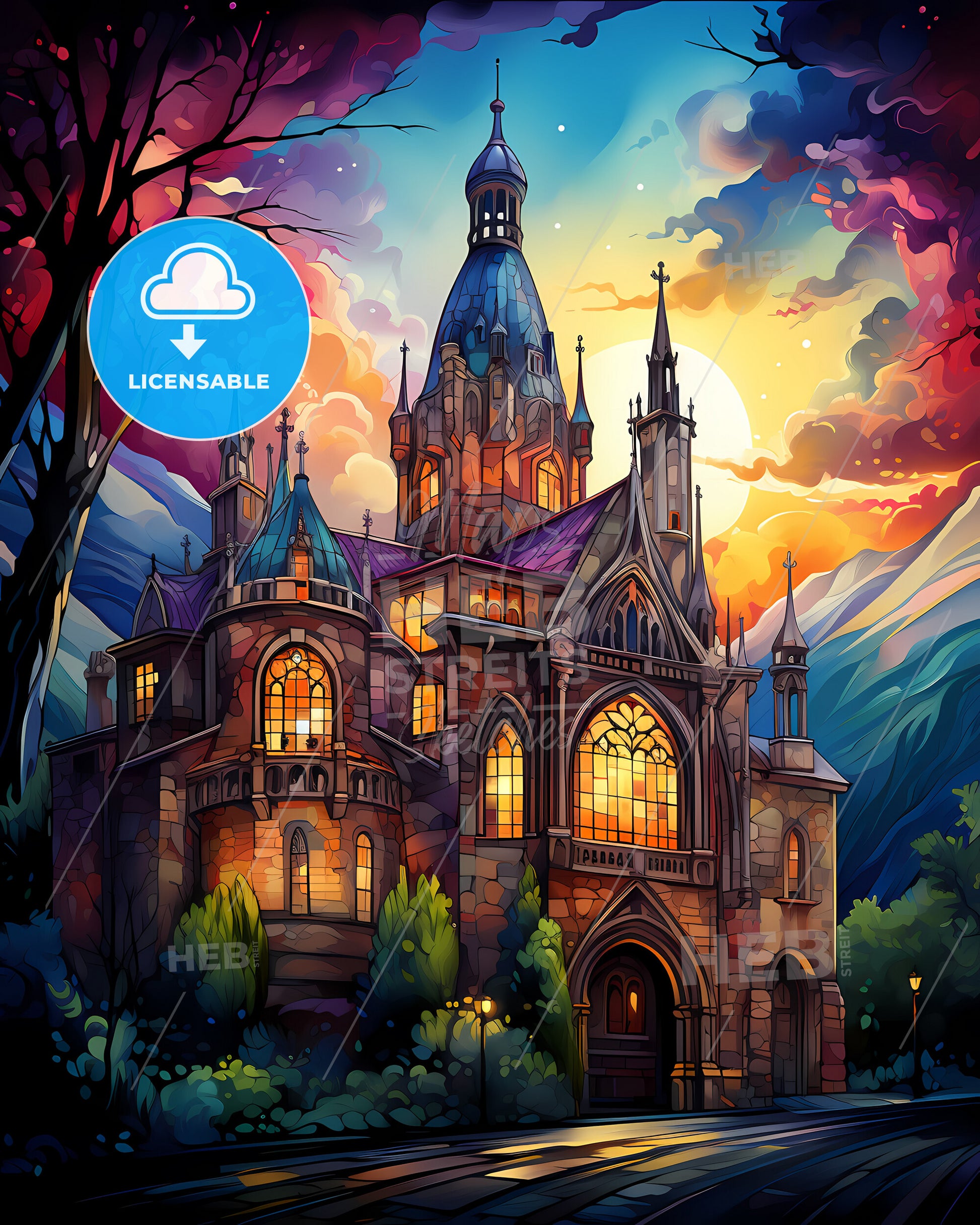 Asheville, North Carolina, a painting of a castle with a colorful sky and trees
