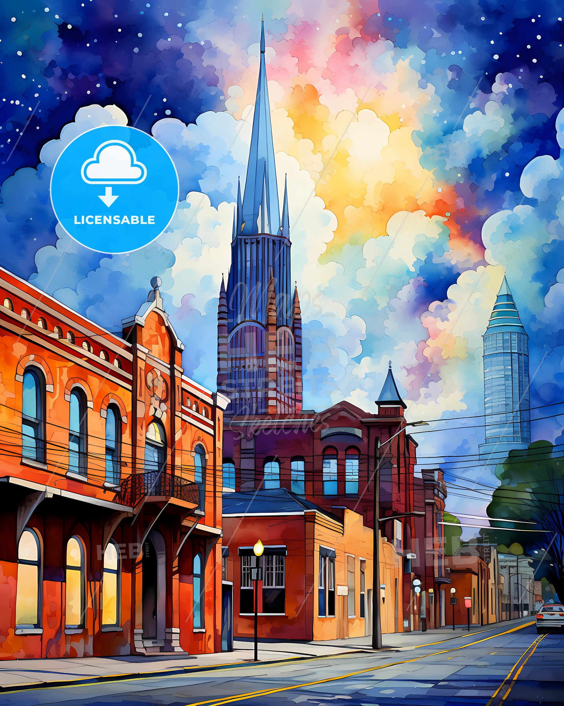 Athens-Clarke County, Georgia, Skyline. art painting with blue sky some bright clouds in spring. in style of classic advertising illustration with nice gradients. Nice strokes and outlines that captures the playful spirit and vivid imagination of modern art.
