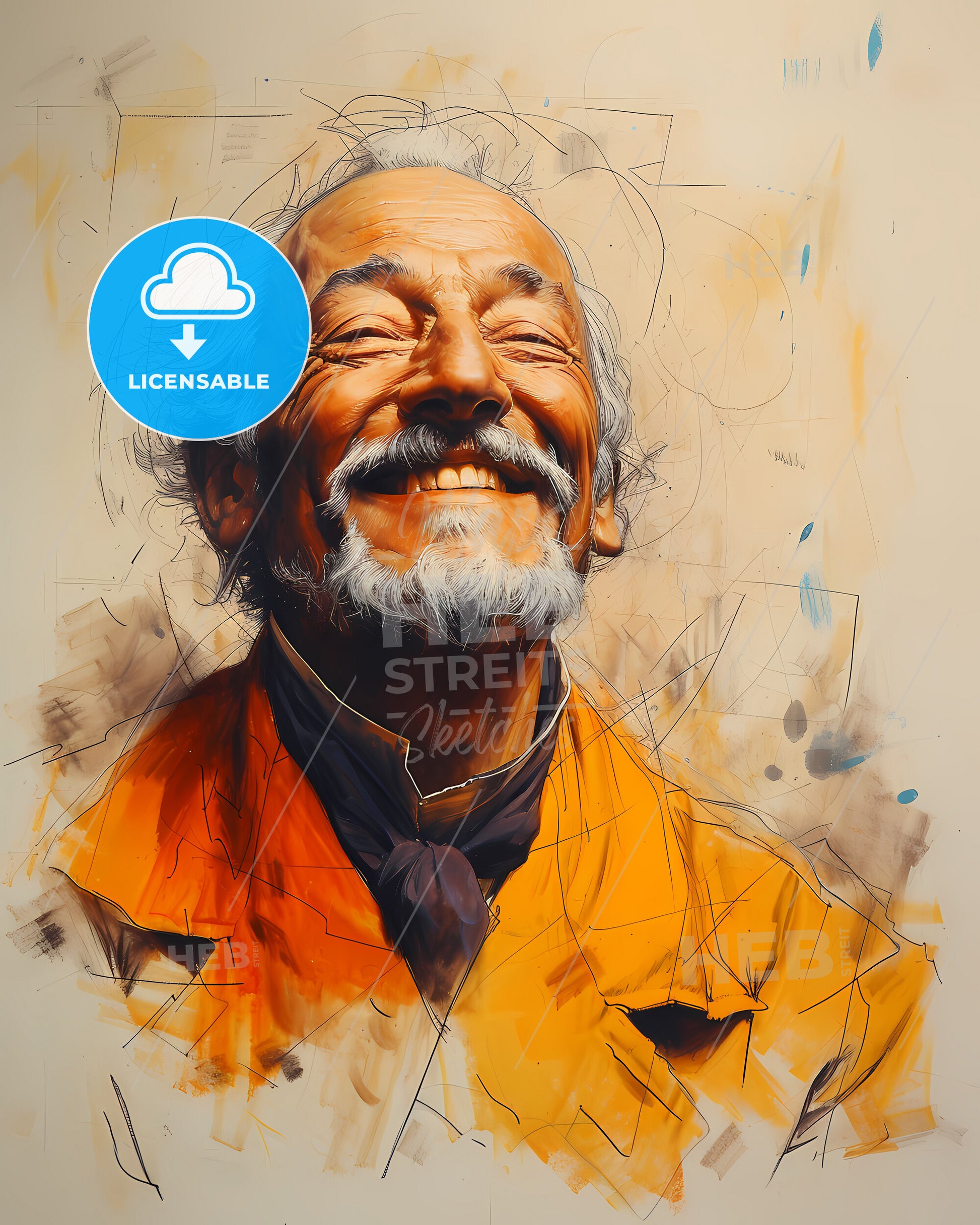 Portrait of Auguste Rodin, 1840 - 1917, Artist, Sculptor, known for "The Thinker" smiling. Vintage art illustration on bright beige paper background, sweeping overdrawn lines, subtile colored artwork, that captures the playful spirit and vivid imagination of modern art.