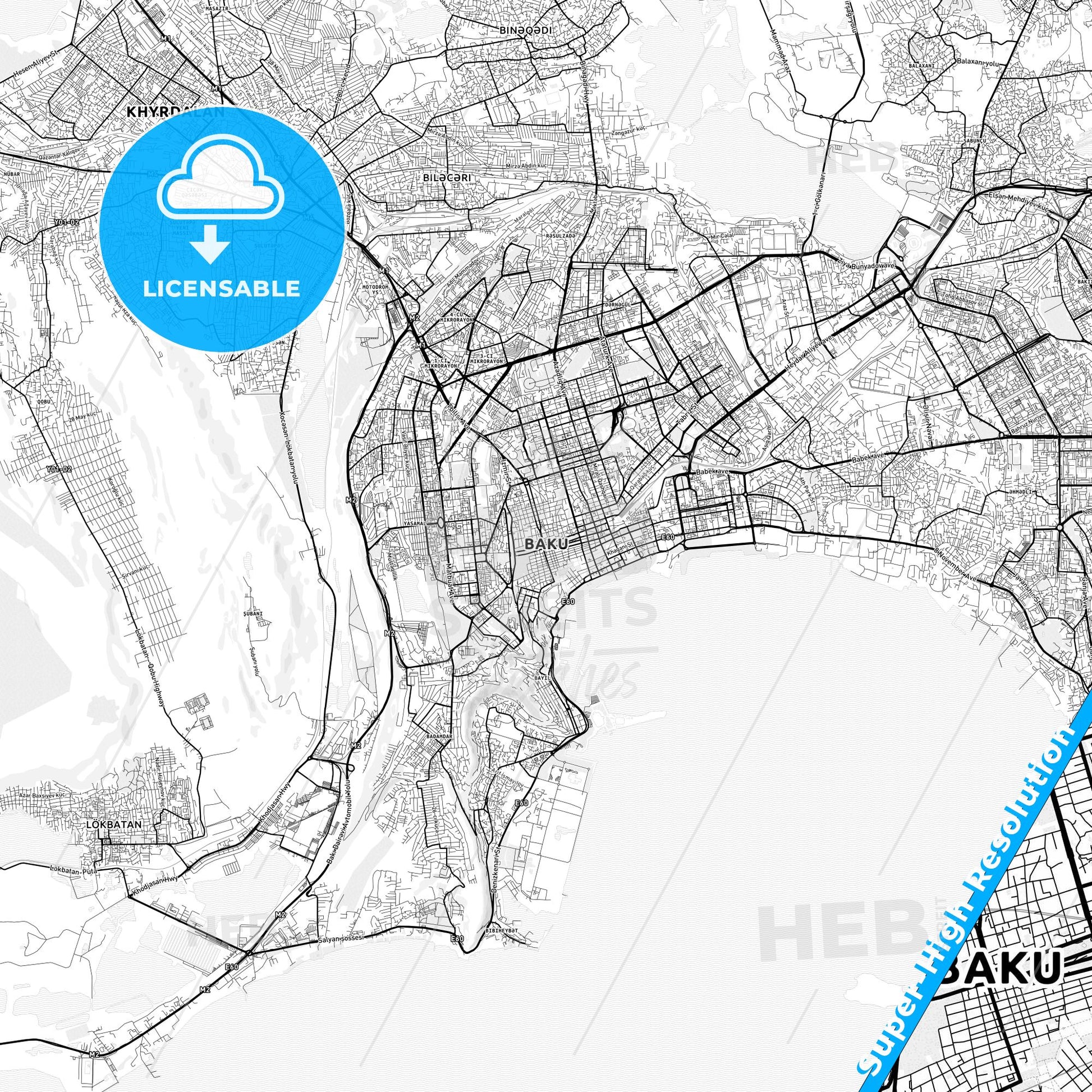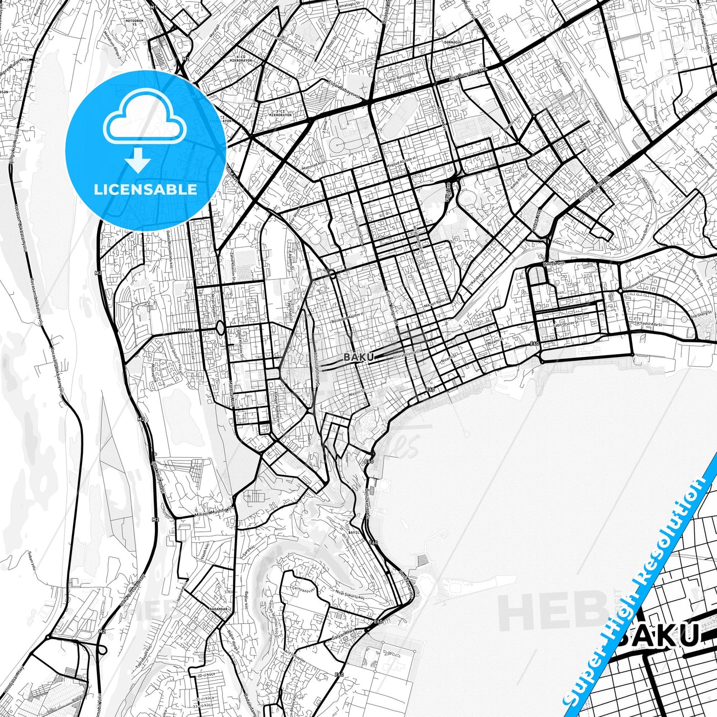 Baku, Azerbaijan in high-resolution, minimalist map designed for printed use. This detailed black and white map accurately highlights the street network and urban layout, making it an ideal ready-to-use map for your business.