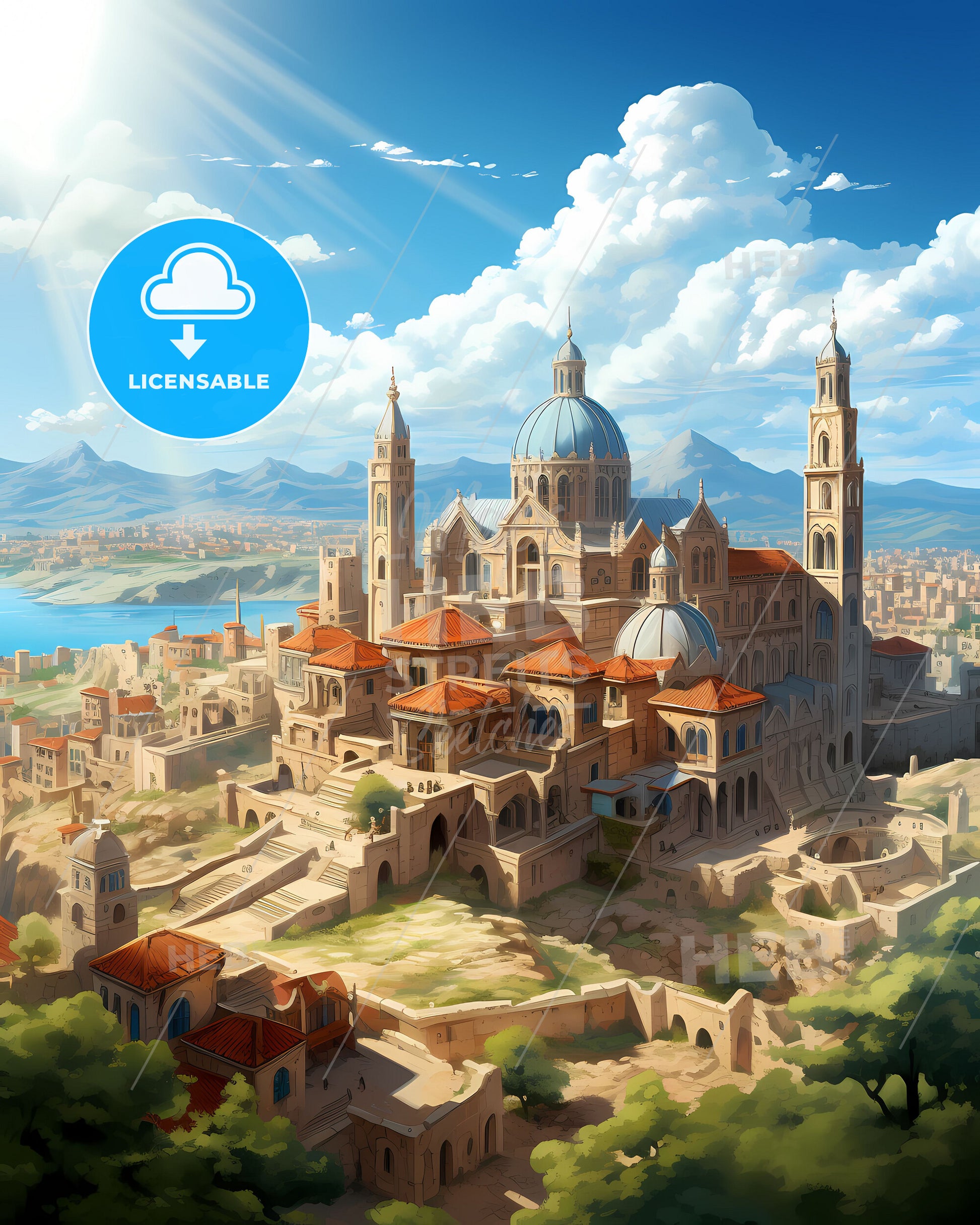 Barcelona, Venezuela Skyline, City Painting Artwork, Blue Dome, Red Roofs, vibrant colors, art, vibrant colors