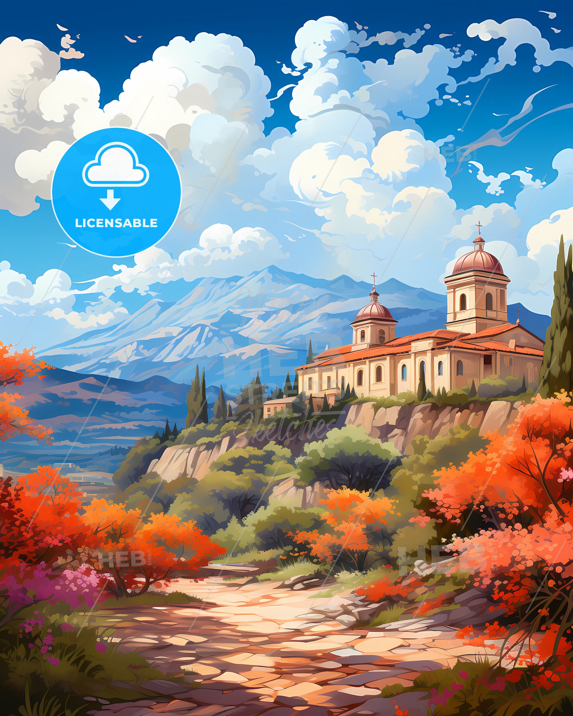 Battipaglia, Campania, Italy, Skyline. art painting with blue sky some bright clouds in spring. in style of classic advertising illustration with nice gradients. Nice strokes and outlines that captures the playful spirit and vivid imagination of modern art.
