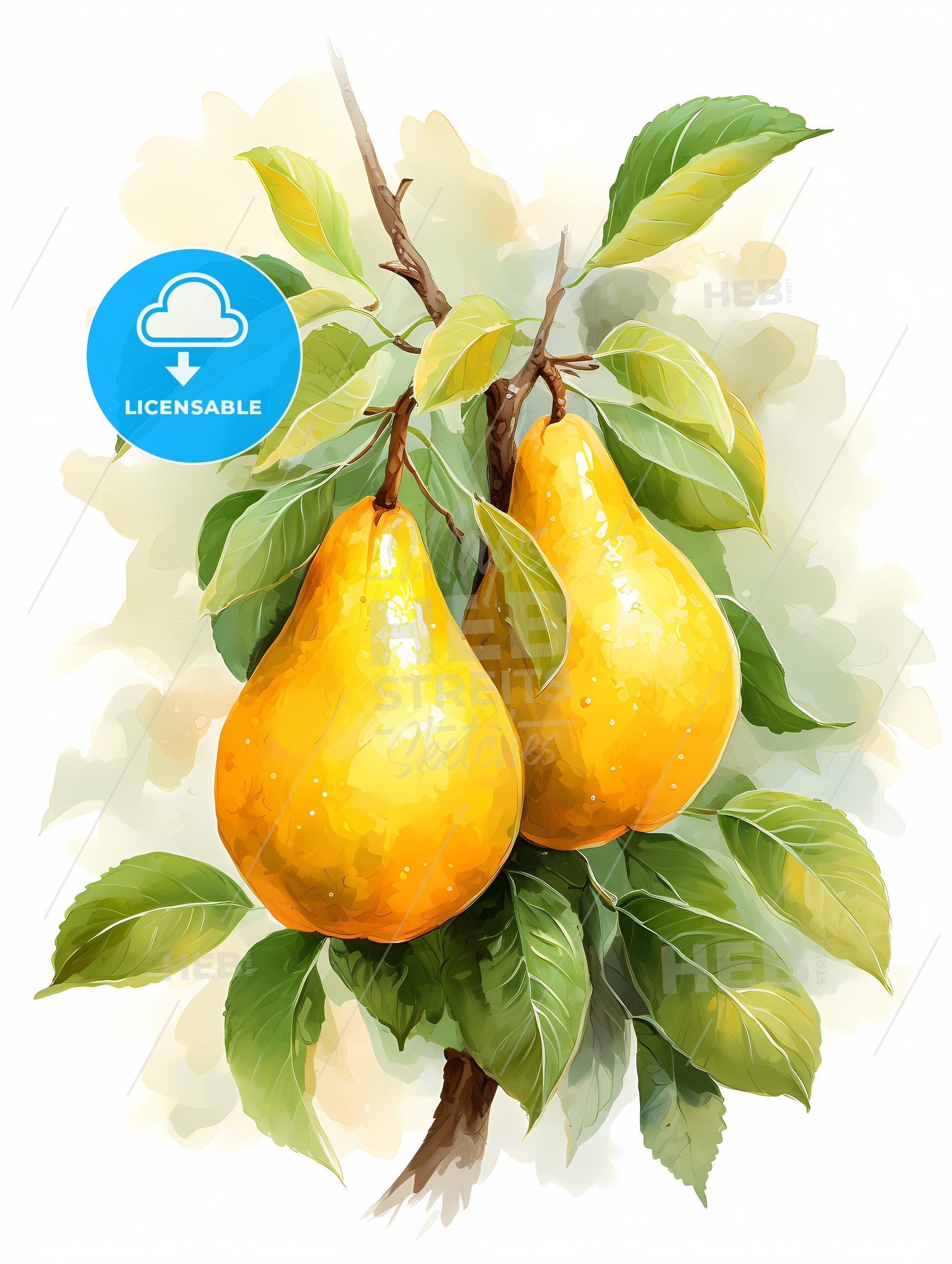 Beautiful Ripe Yellow Pears On A White Background - a pair of yellow pears on a tree branch