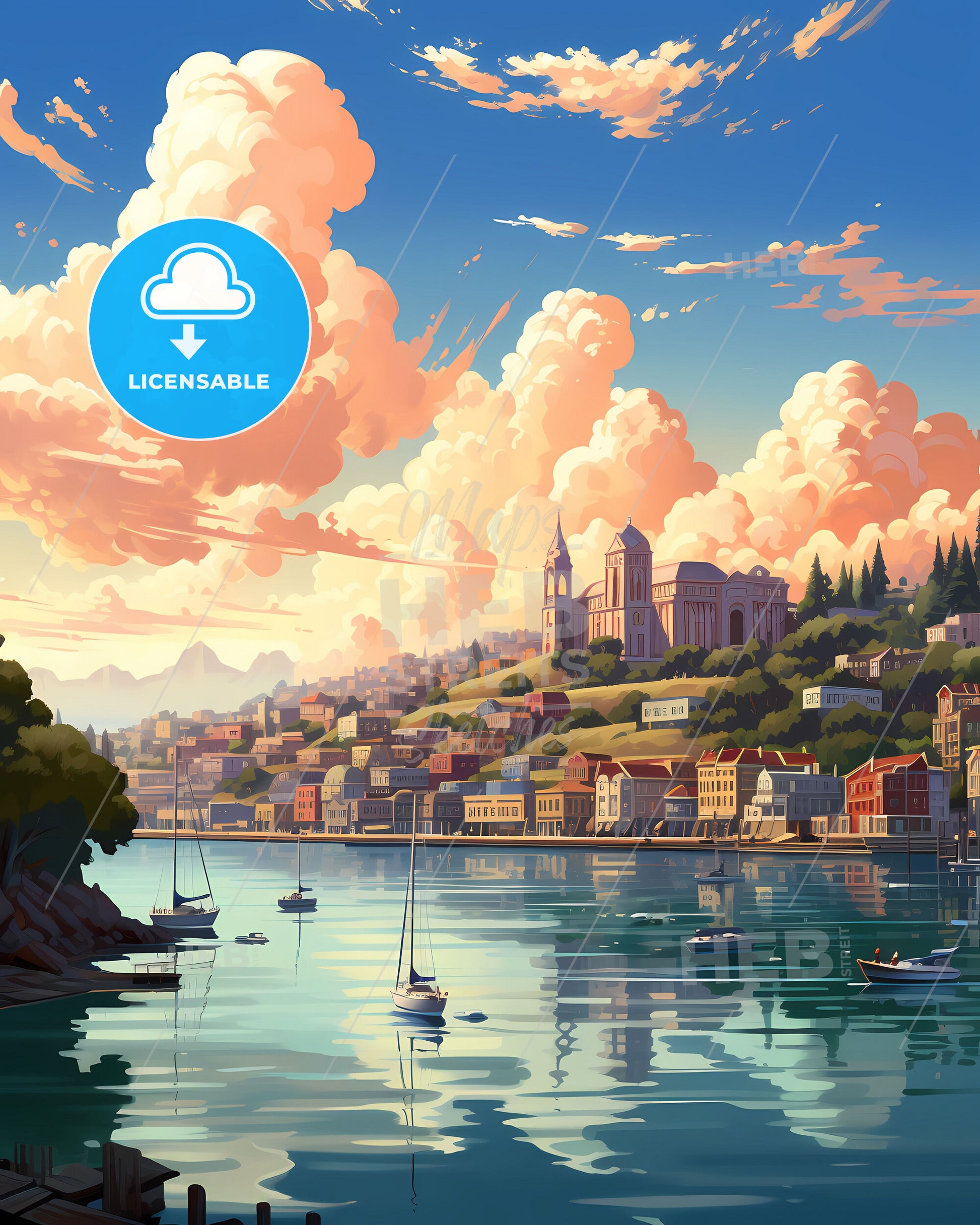 Vibrant Skyline Painting of Beira City Mozambique Coastline Housing Boats Boats