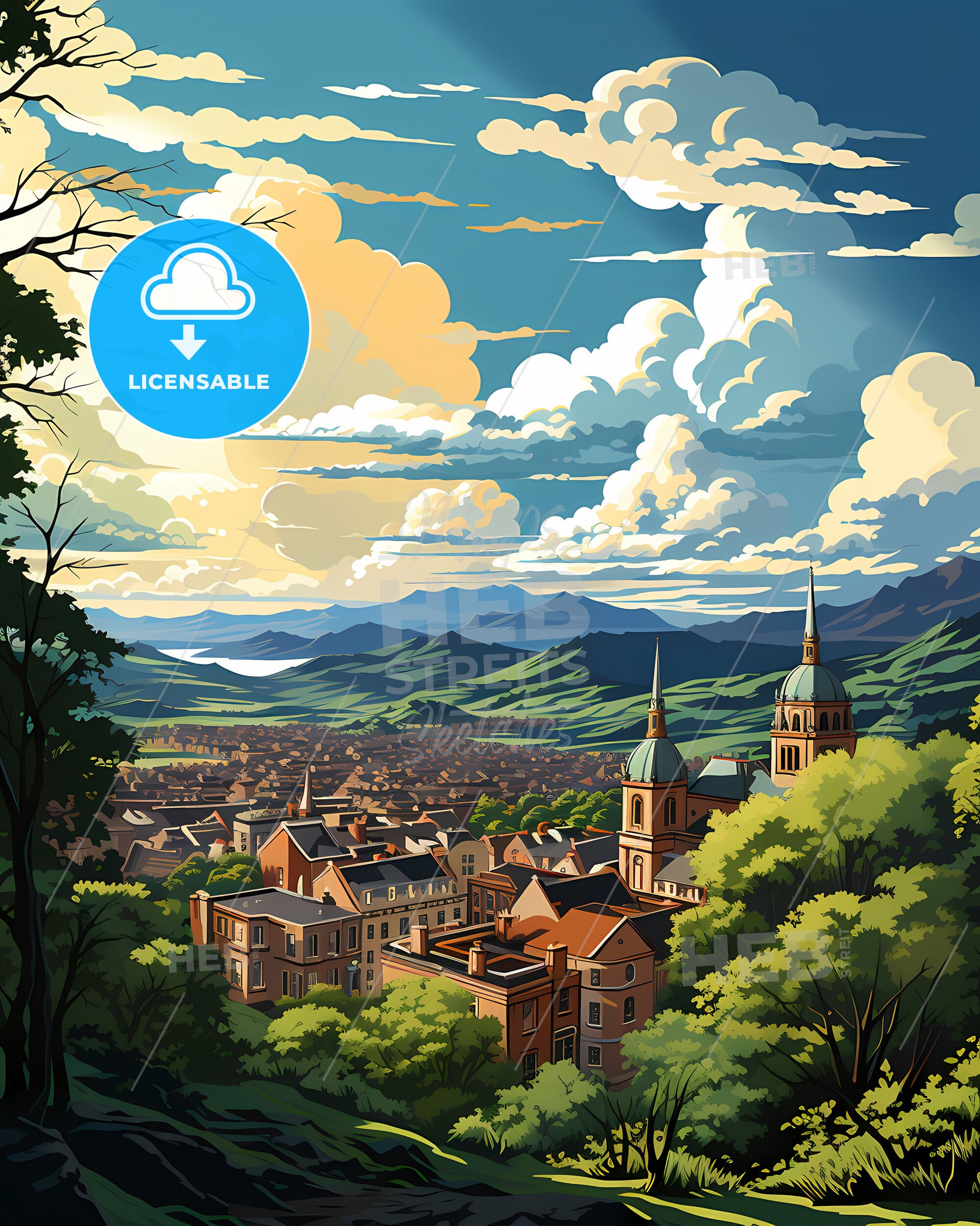 Belfast, Belfast, Skyline. art painting with blue sky some bright clouds in spring. in style of classic advertising illustration with nice gradients. Nice strokes and outlines that captures the playful spirit and vivid imagination of modern art.