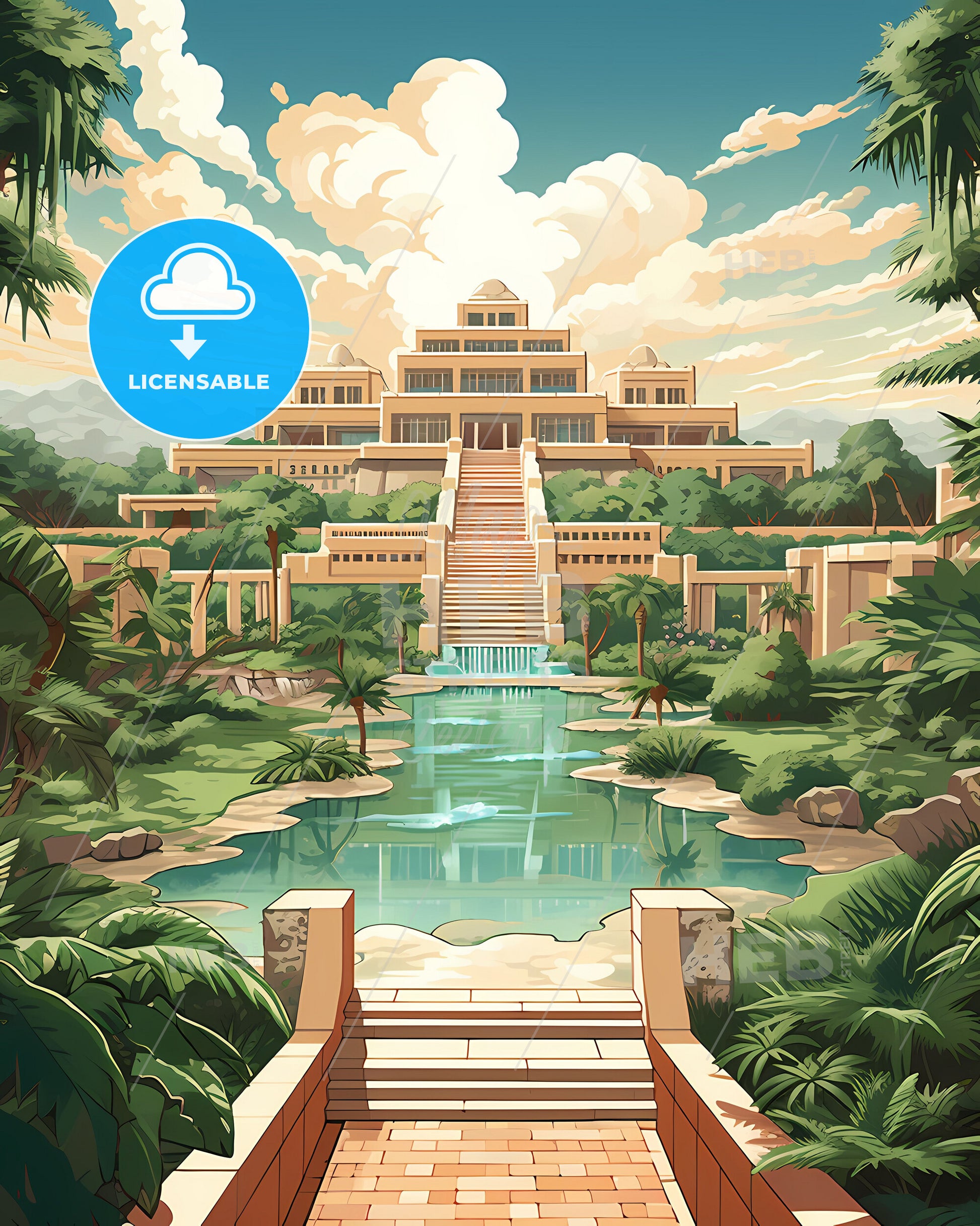 Vibrant Benin City Nigeria Skyline Art Painting Featuring Stairs Leading to Pool Water