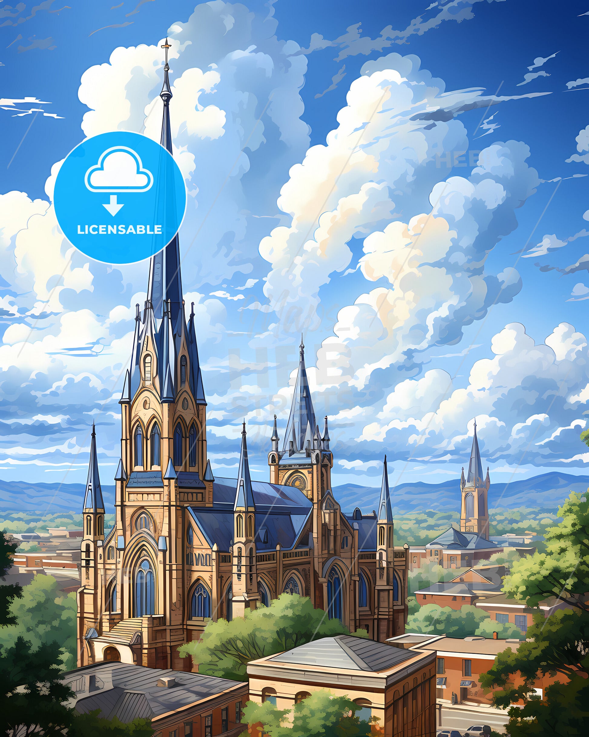 Birmingham, Alabama, Skyline. art painting with blue sky some bright clouds in spring. in style of classic advertising illustration with nice gradients. Nice strokes and outlines that captures the playful spirit and vivid imagination of modern art.