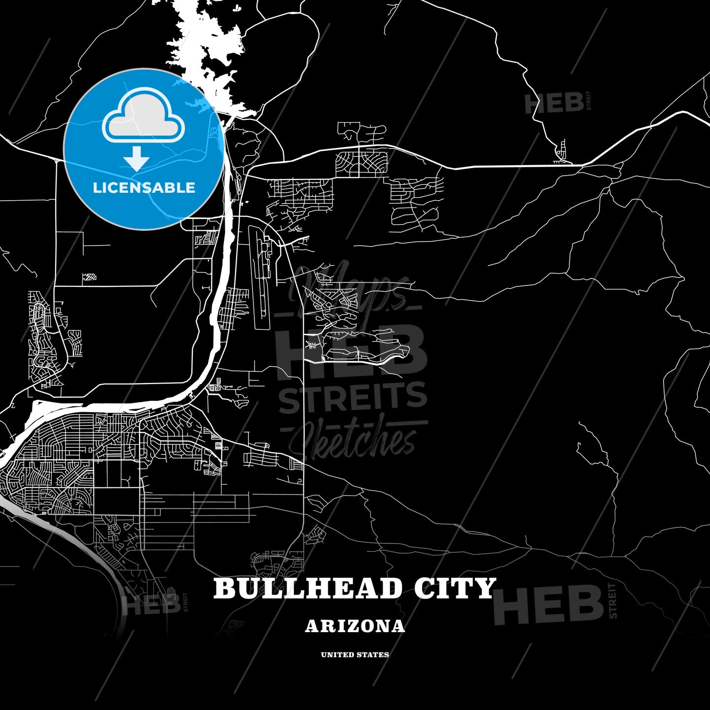 This black map template of Bullhead City is designed for posters in portrait and square formats. We recommend the PDF−Vector format for larger prints. The entire text has not been converted to outlines and can be changed as needed. The font is not embedded in the file.
