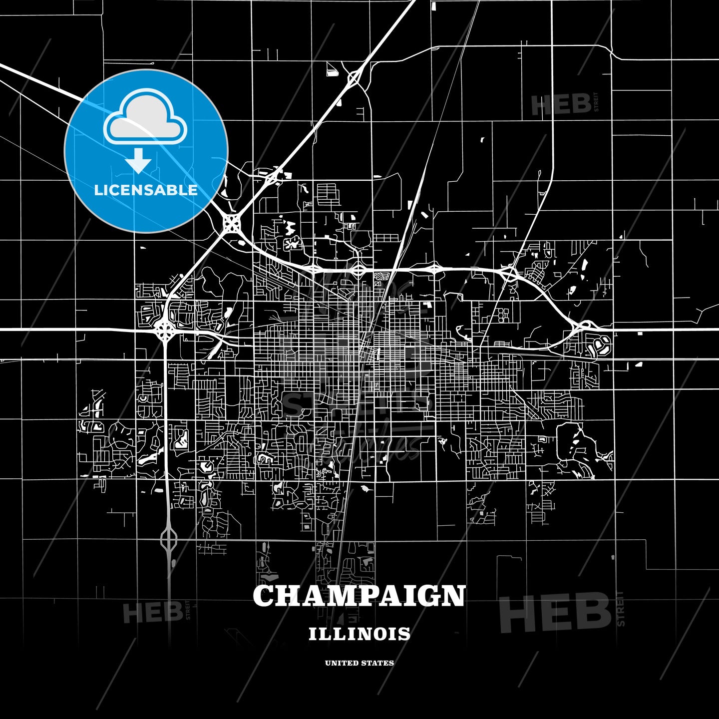 This black map template of Champaign is designed for posters in portrait and square formats. We recommend the PDF−Vector format for larger prints. The entire text has not been converted to outlines and can be changed as needed. The font is not embedded in the file.