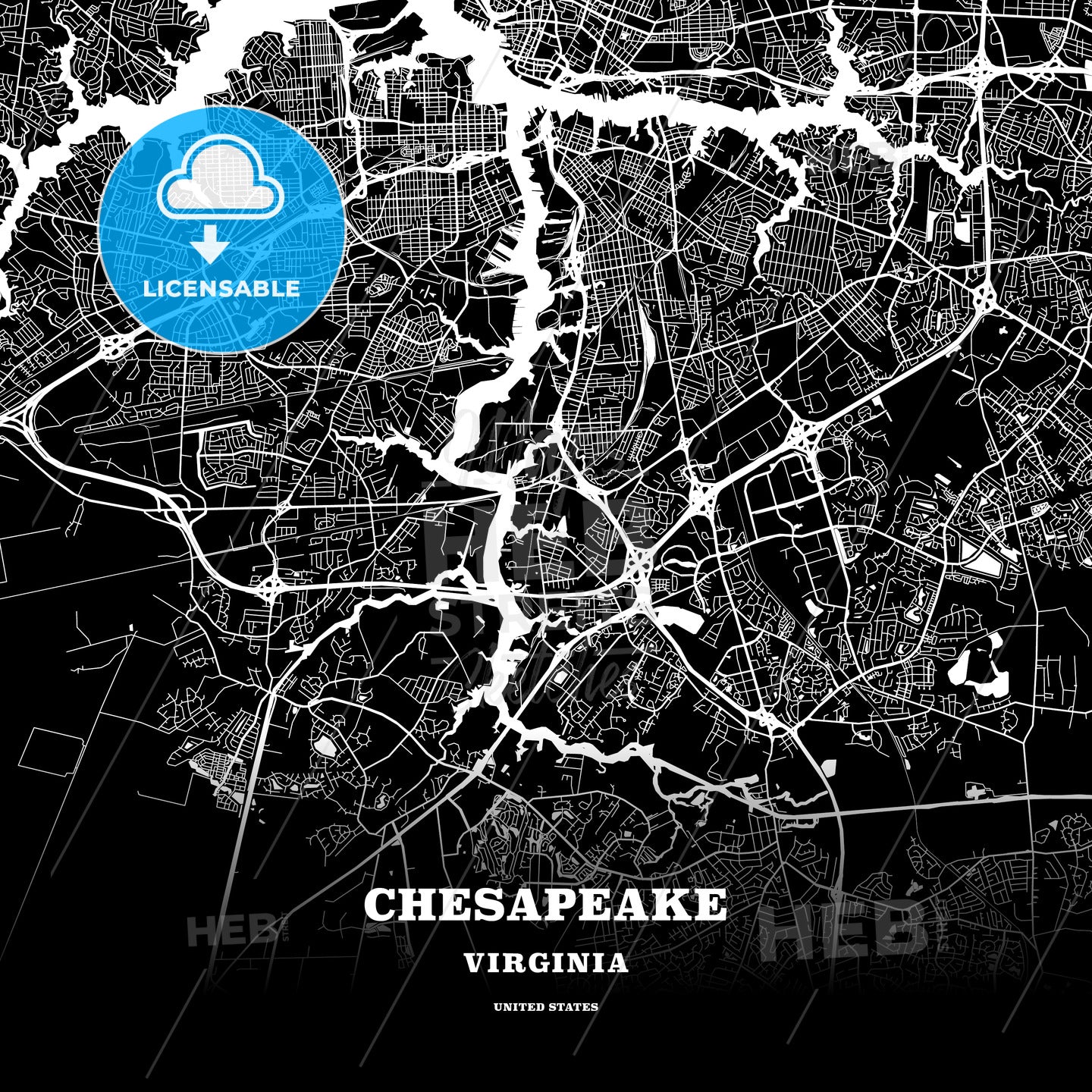 This black map template of Chesapeake is designed for posters in portrait and square formats. We recommend the PDF−Vector format for larger prints. The entire text has not been converted to outlines and can be changed as needed. The font is not embedded in the file.
