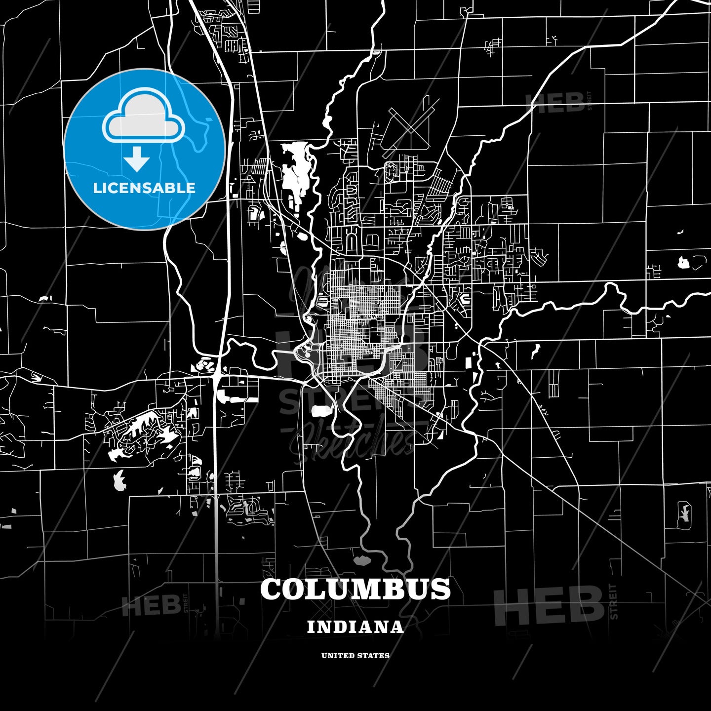 This black map template of Columbus is designed for posters in portrait and square formats. We recommend the PDF−Vector format for larger prints. The entire text has not been converted to outlines and can be changed as needed. The font is not embedded in the file.