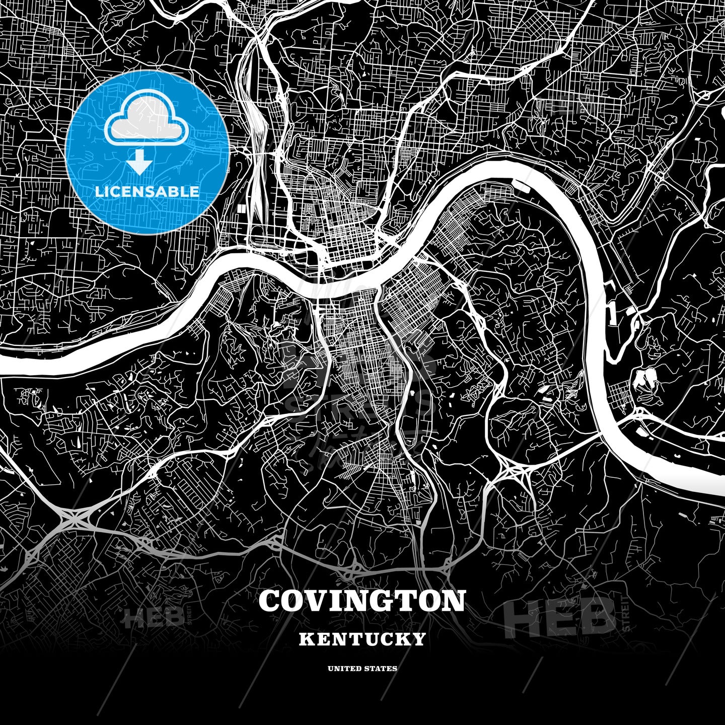This black map template of Covington is designed for posters in portrait and square formats. We recommend the PDF−Vector format for larger prints. The entire text has not been converted to outlines and can be changed as needed. The font is not embedded in the file.