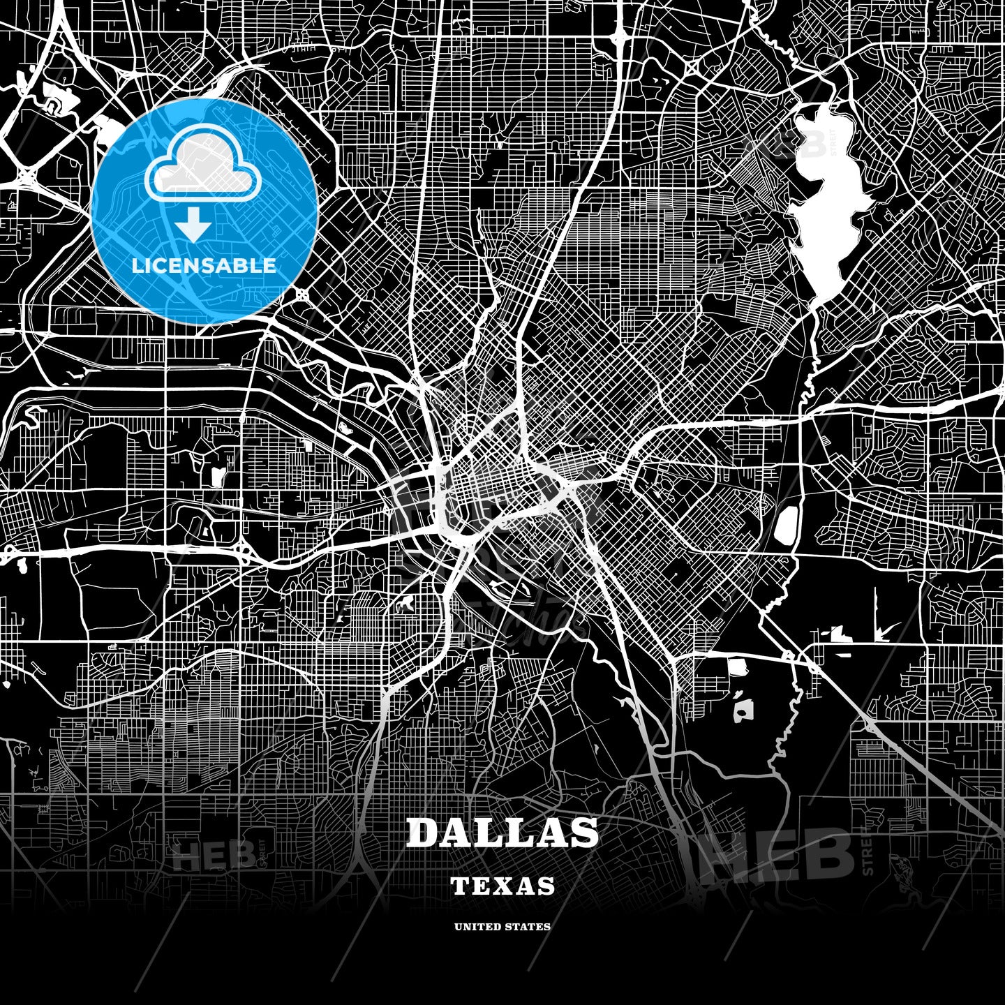 This black map template of Dallas is designed for posters in portrait and square formats. We recommend the PDF−Vector format for larger prints. The entire text has not been converted to outlines and can be changed as needed. The font is not embedded in the file.