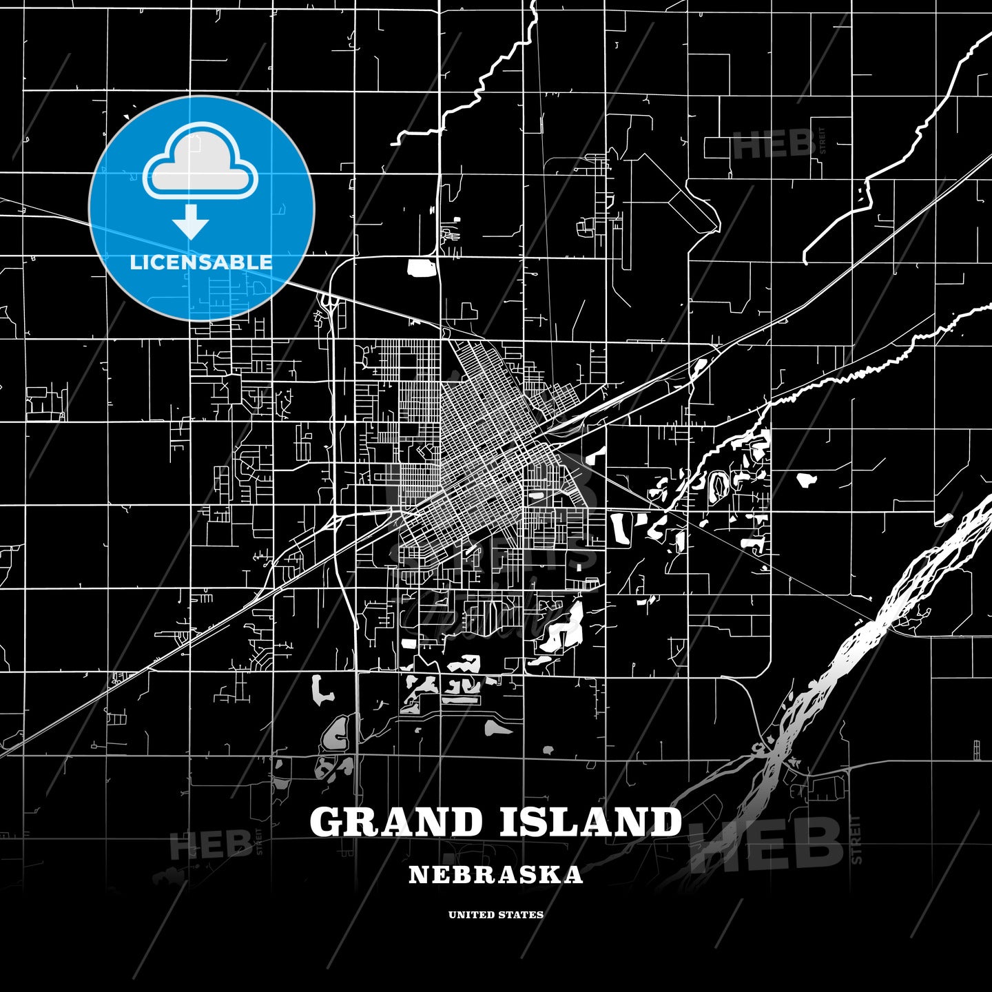 This black map template of Grand Island is designed for posters in portrait and square formats. We recommend the PDF−Vector format for larger prints. The entire text has not been converted to outlines and can be changed as needed. The font is not embedded in the file.
