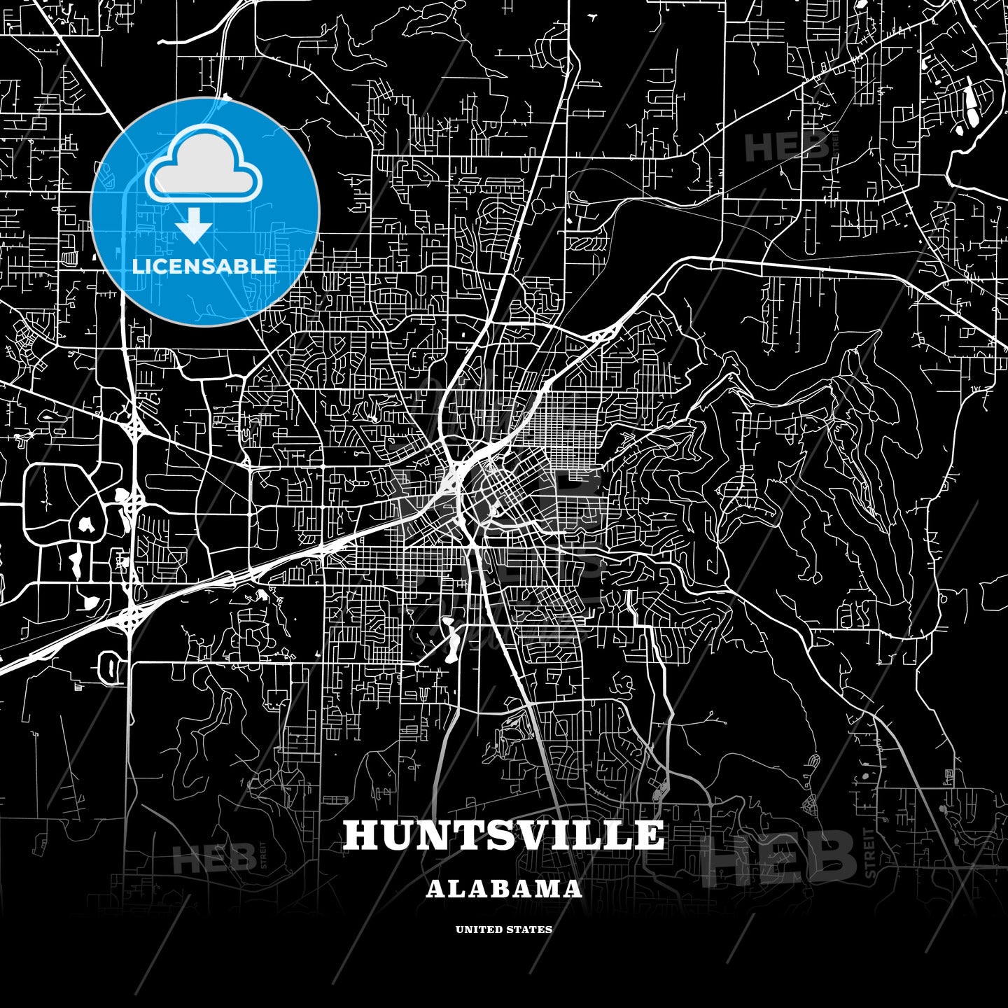 This black map template of Huntsville is designed for posters in portrait and square formats. We recommend the PDF−Vector format for larger prints. The entire text has not been converted to outlines and can be changed as needed. The font is not embedded in the file.