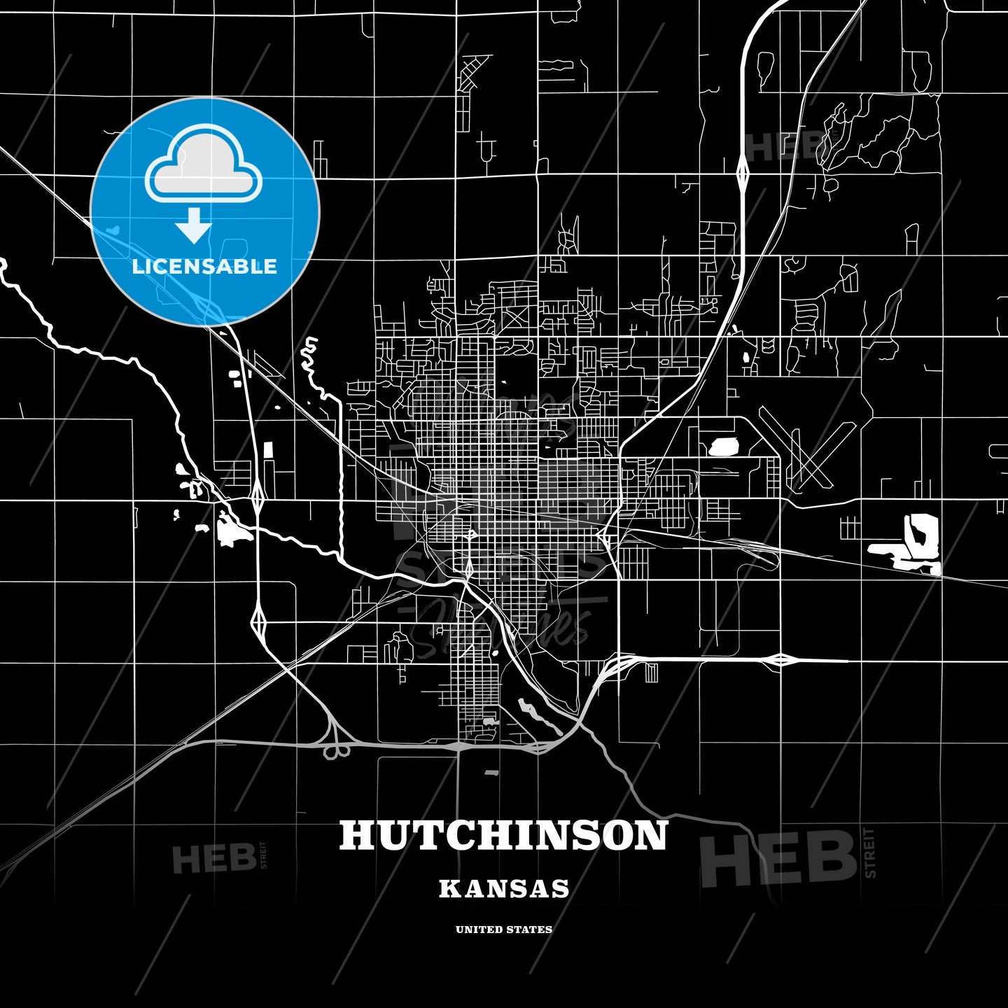 This black map template of Hutchinson is designed for posters in portrait and square formats. We recommend the PDF−Vector format for larger prints. The entire text has not been converted to outlines and can be changed as needed. The font is not embedded in the file.