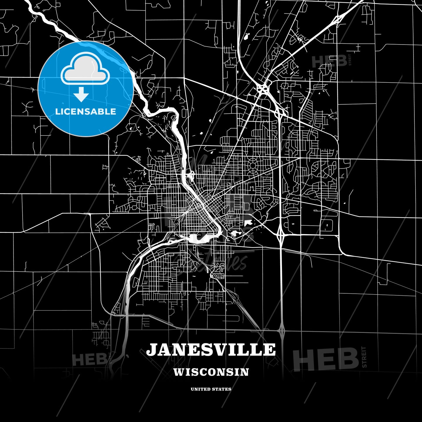 This black map template of Janesville is designed for posters in portrait and square formats. We recommend the PDF−Vector format for larger prints. The entire text has not been converted to outlines and can be changed as needed. The font is not embedded in the file.
