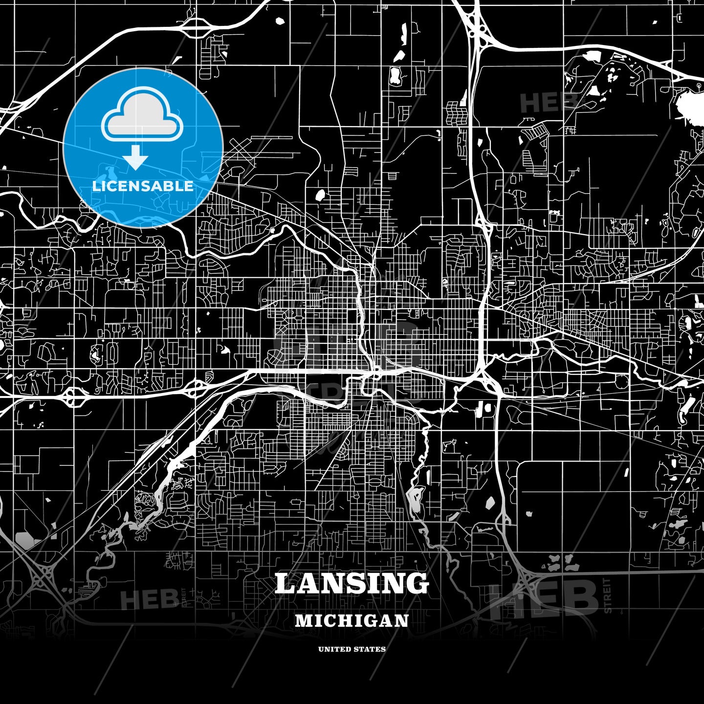 This black map template of Lansing is designed for posters in portrait and square formats. We recommend the PDF−Vector format for larger prints. The entire text has not been converted to outlines and can be changed as needed. The font is not embedded in the file.