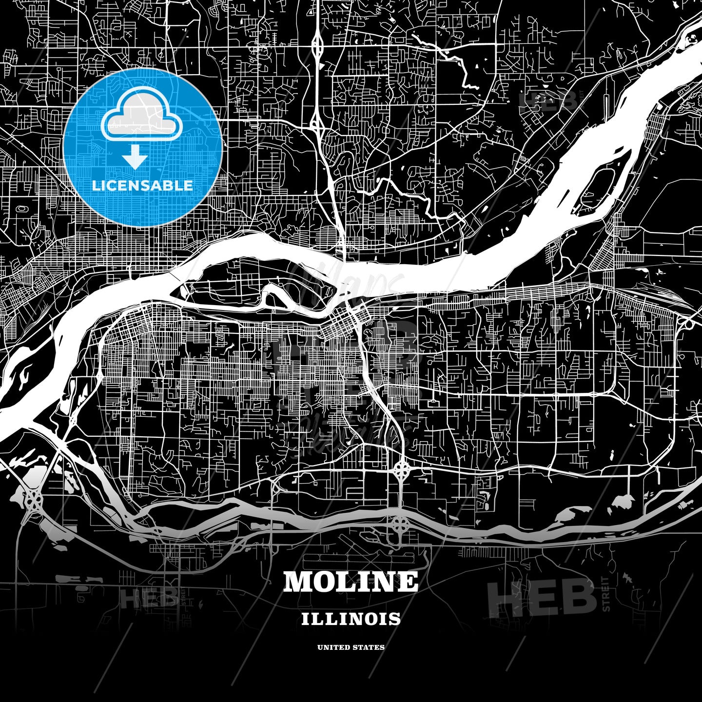 This black map template of Moline is designed for posters in portrait and square formats. We recommend the PDF−Vector format for larger prints. The entire text has not been converted to outlines and can be changed as needed. The font is not embedded in the file.