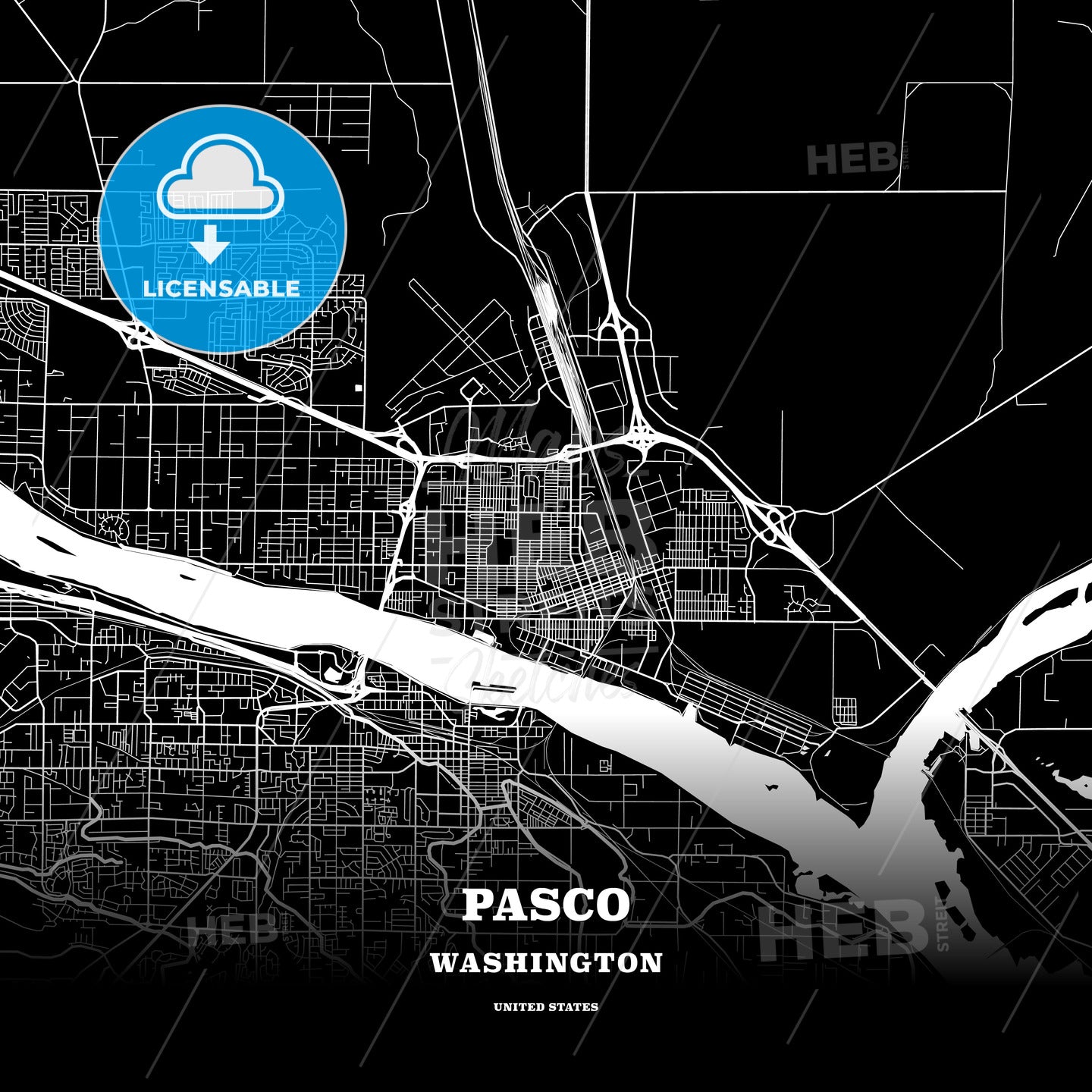 This black map template of Pasco is designed for posters in portrait and square formats. We recommend the PDF−Vector format for larger prints. The entire text has not been converted to outlines and can be changed as needed. The font is not embedded in the file.