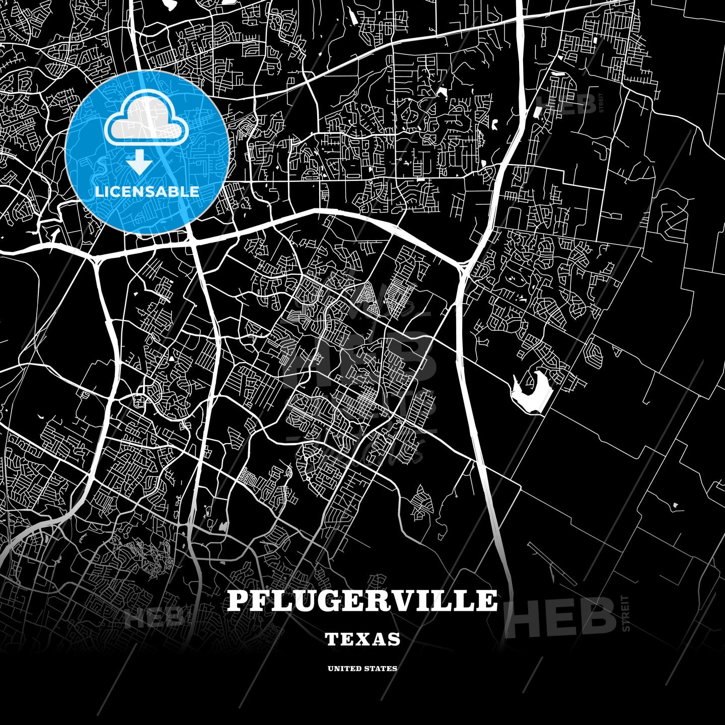 This black map template of Pflugerville is designed for posters in portrait and square formats. We recommend the PDF−Vector format for larger prints. The entire text has not been converted to outlines and can be changed as needed. The font is not embedded in the file.