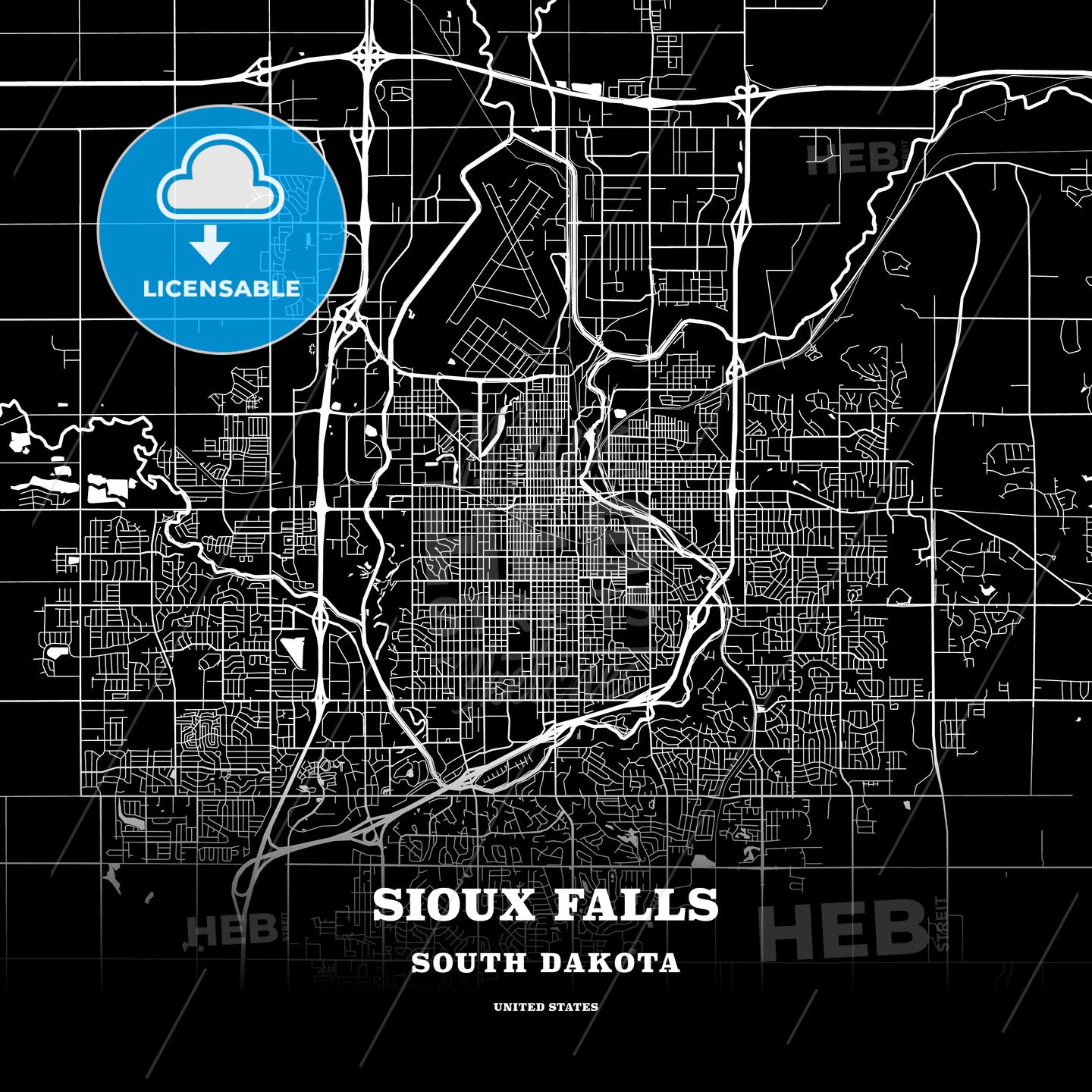 Black map poster template of Sioux Falls, South Dakota, United States.