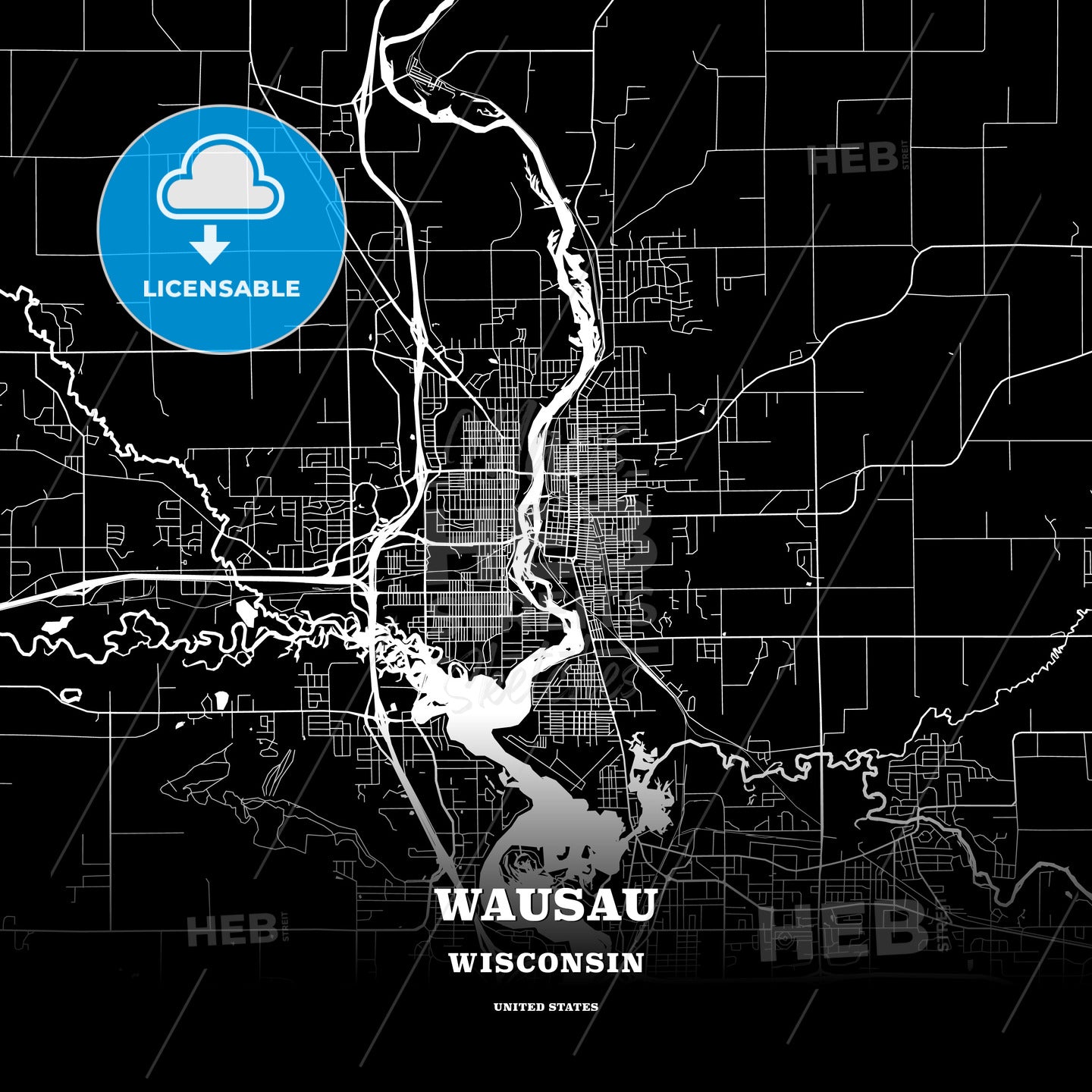 This black map template of Wausau is designed for posters in portrait and square formats. We recommend the PDF−Vector format for larger prints. The entire text has not been converted to outlines and can be changed as needed. The font is not embedded in the file.