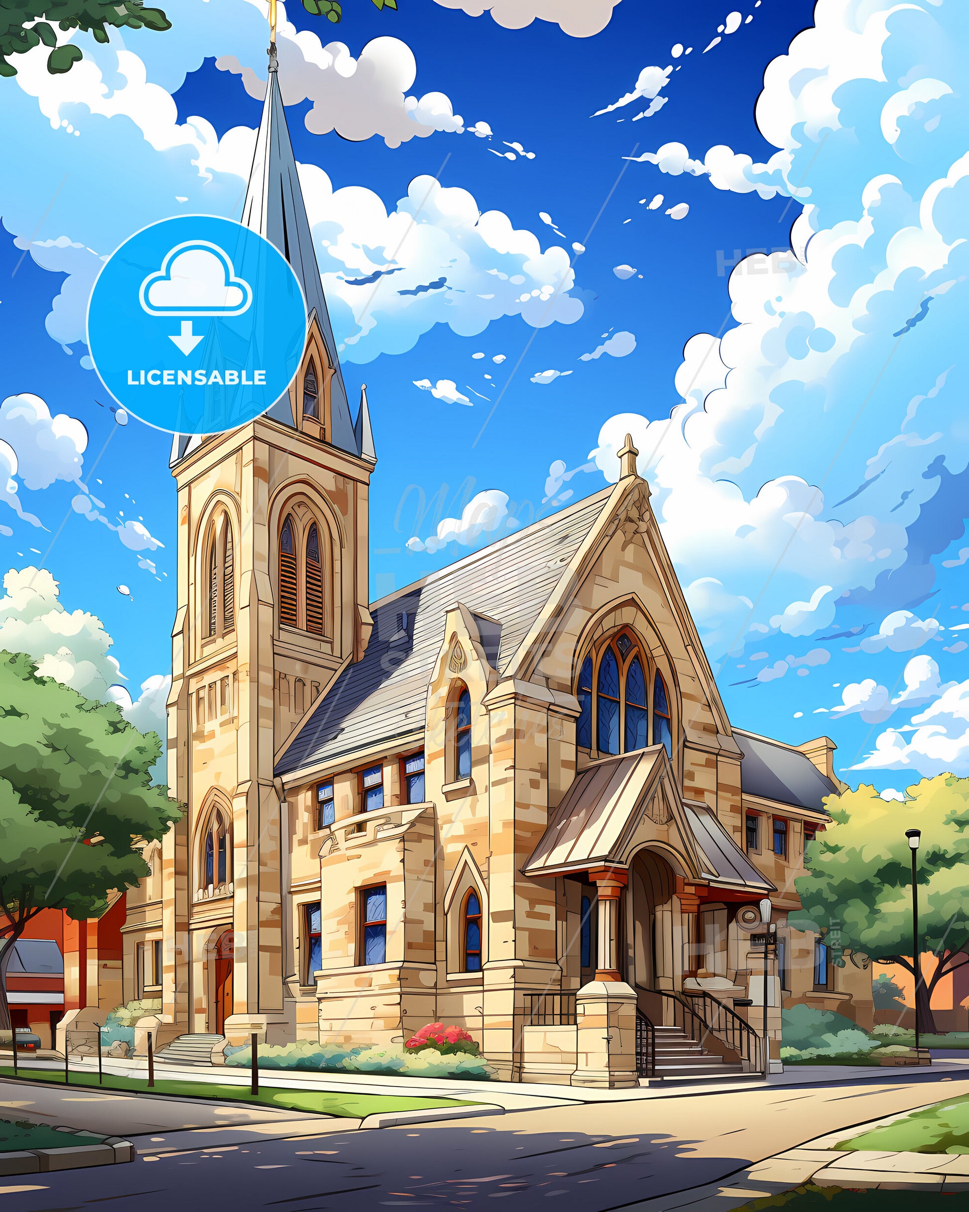 Bloomington, Indiana, Skyline. art painting with blue sky some bright clouds in spring. in style of classic advertising illustration with nice gradients. Nice strokes and outlines that captures the playful spirit and vivid imagination of modern art.