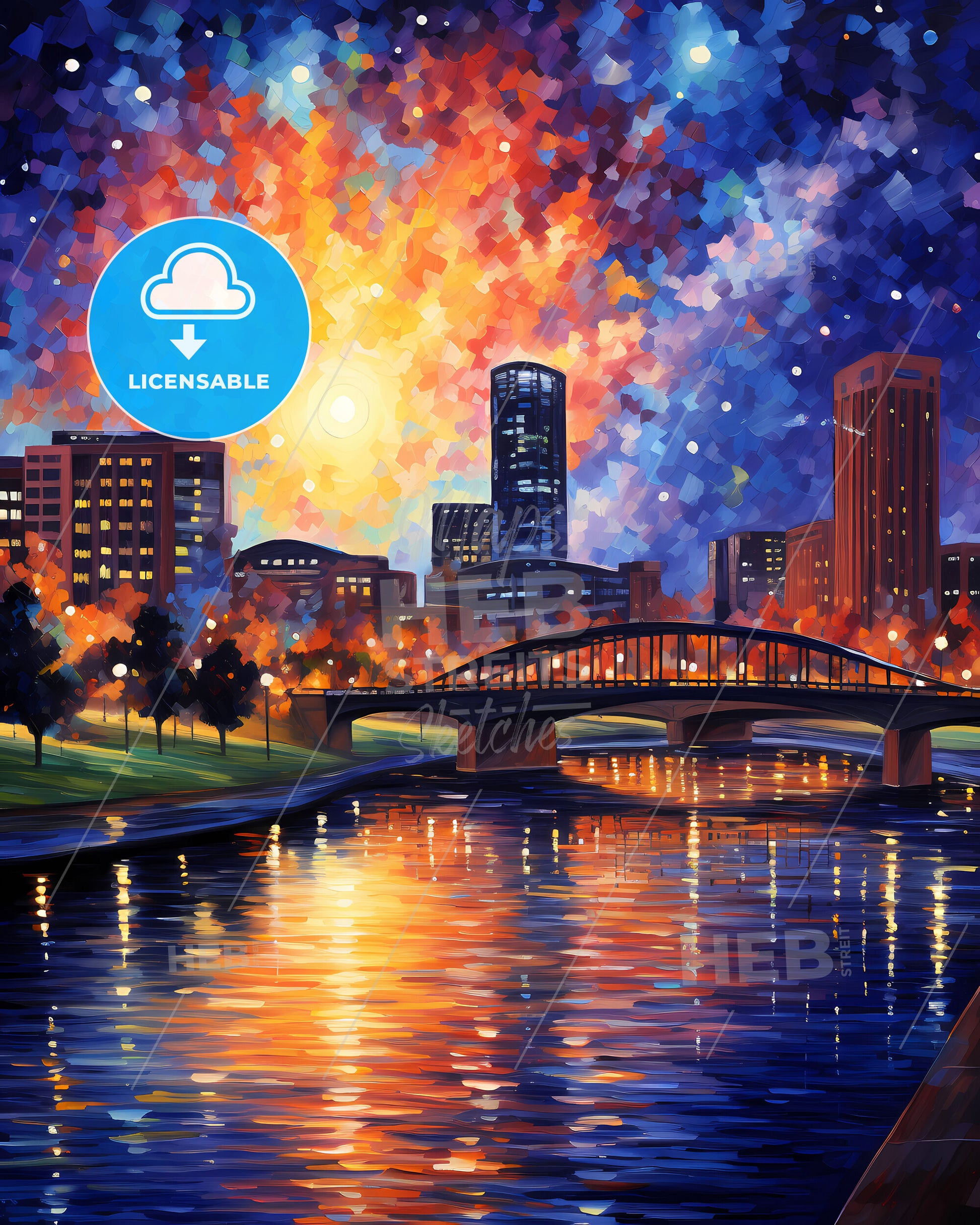 Bossier City, Louisiana, Skyline. art painting with blue sky some bright clouds in spring. in style of classic advertising illustration with nice gradients. Nice strokes and outlines that captures the playful spirit and vivid imagination of modern art.