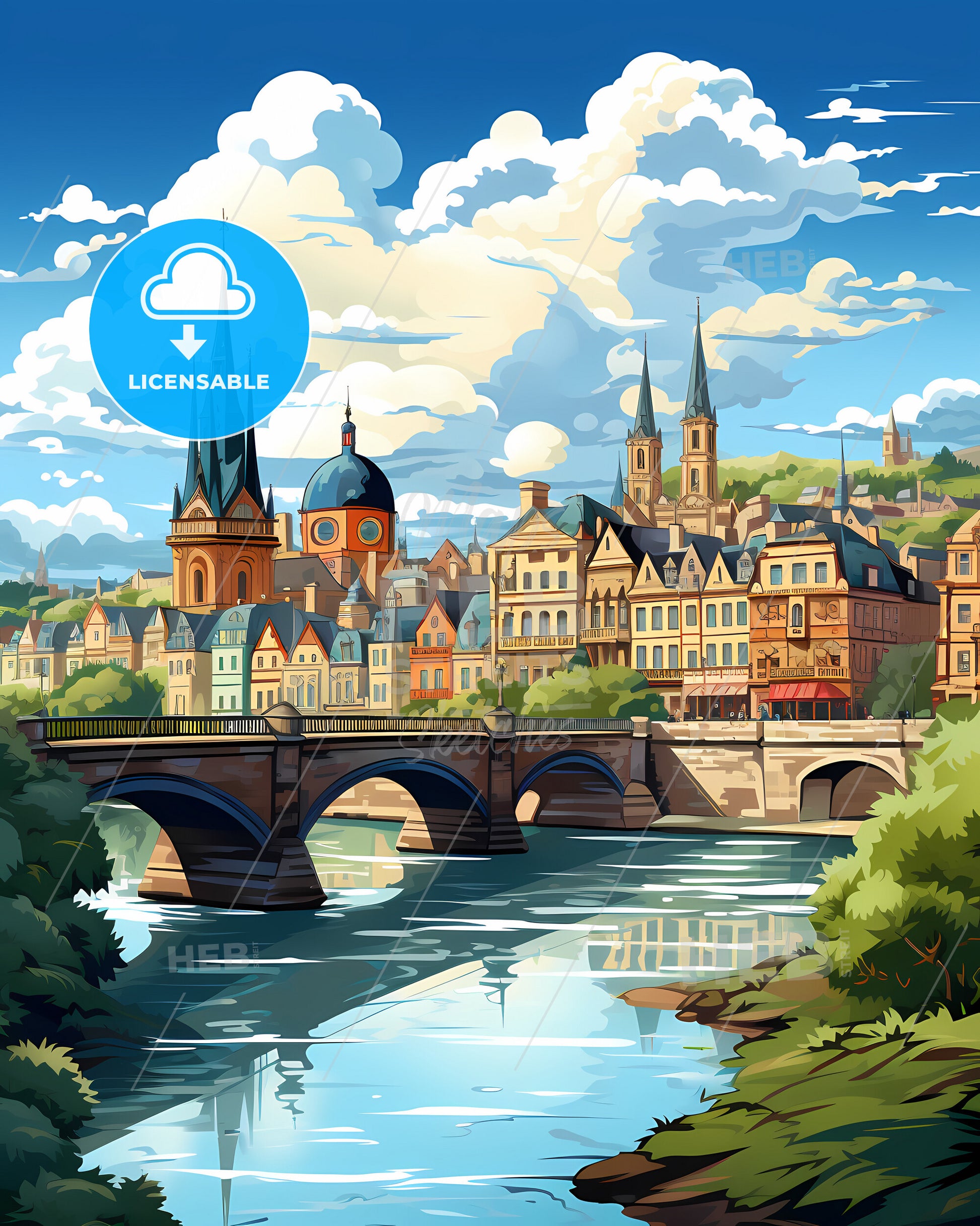 Bradford, Yorkshire and the Humber, Skyline. art painting with blue sky some bright clouds in spring. in style of classic advertising illustration with nice gradients. Nice strokes and outlines that captures the playful spirit and vivid imagination of modern art.
