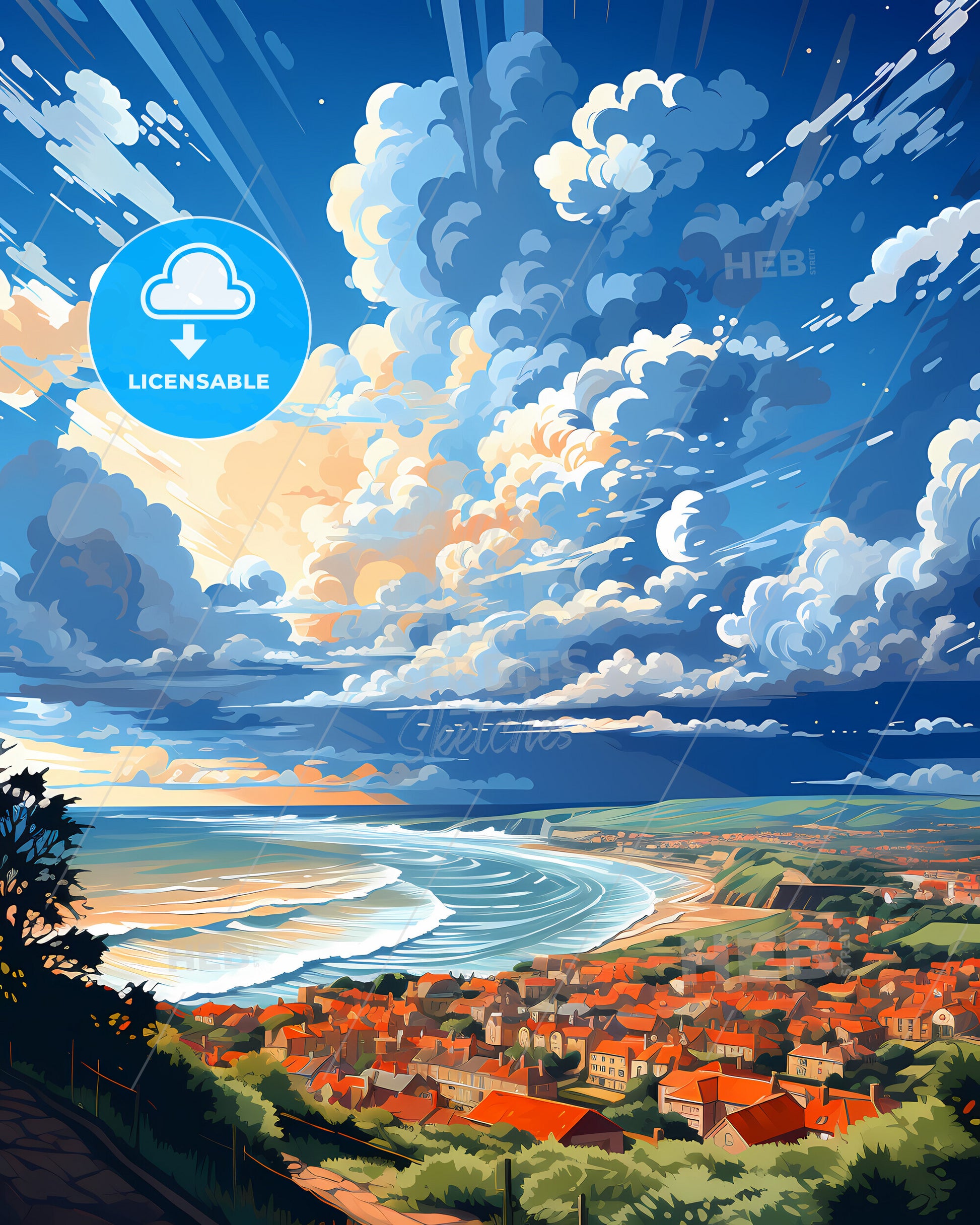 Brighton and Hove, South East England, Skyline. art painting with blue sky some bright clouds in spring. in style of classic advertising illustration with nice gradients. Nice strokes and outlines that captures the playful spirit and vivid imagination of modern art.