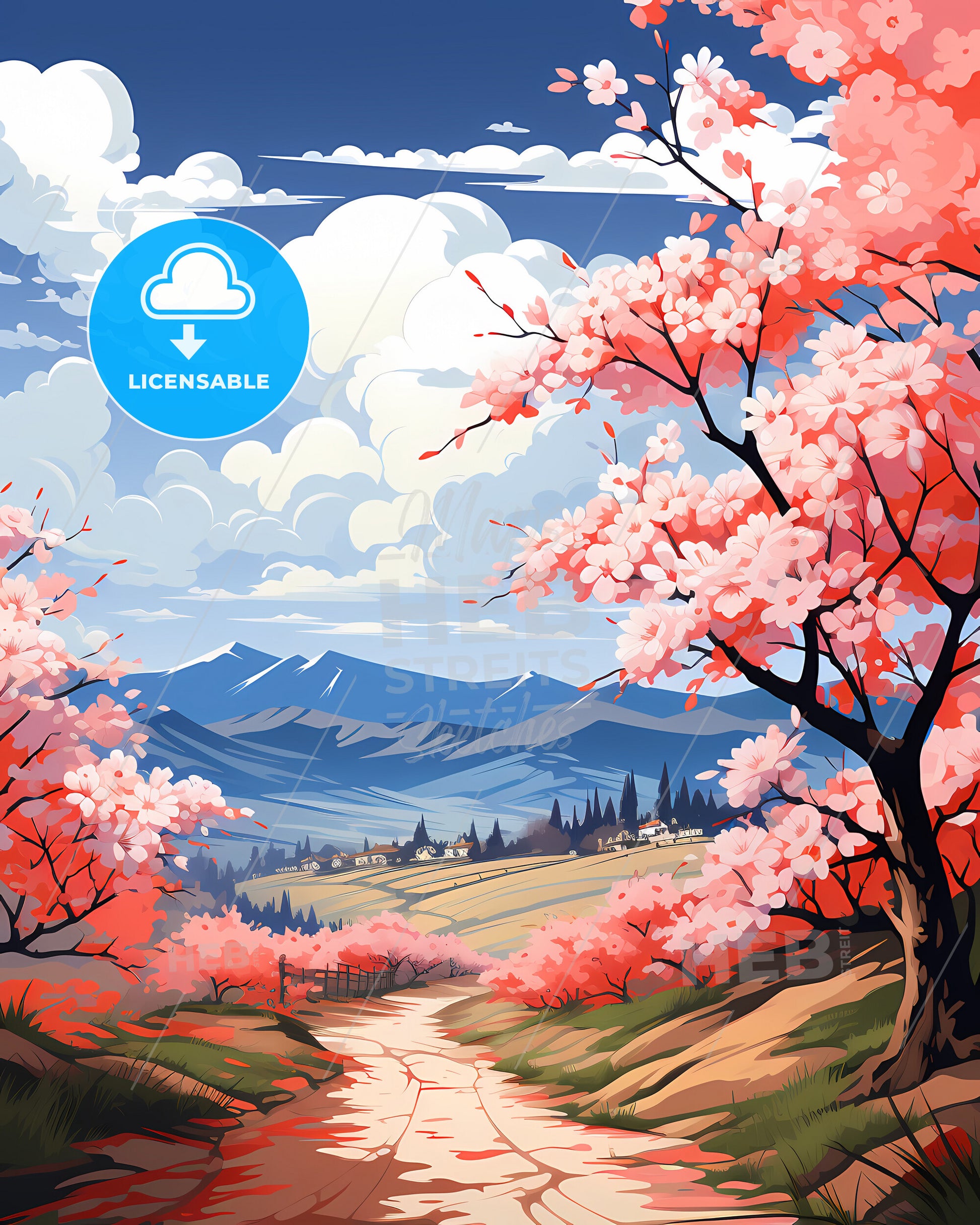 Broomfield, Colorado, Skyline. art painting with blue sky some bright clouds in spring. in style of classic advertising illustration with nice gradients. Nice strokes and outlines that captures the playful spirit and vivid imagination of modern art.