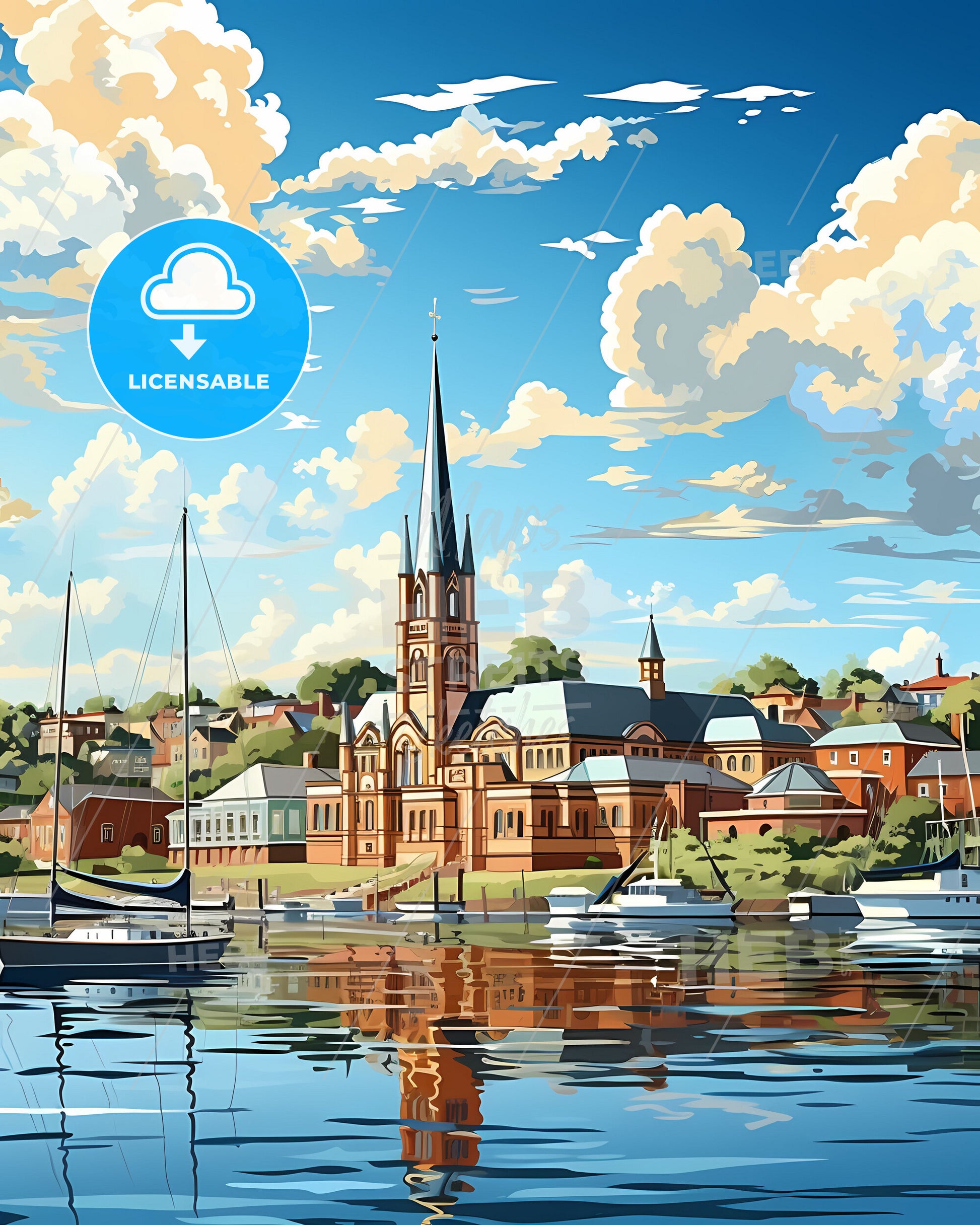Vibrant Painting of Bunbury Town Skyline Featuring Boats on Water