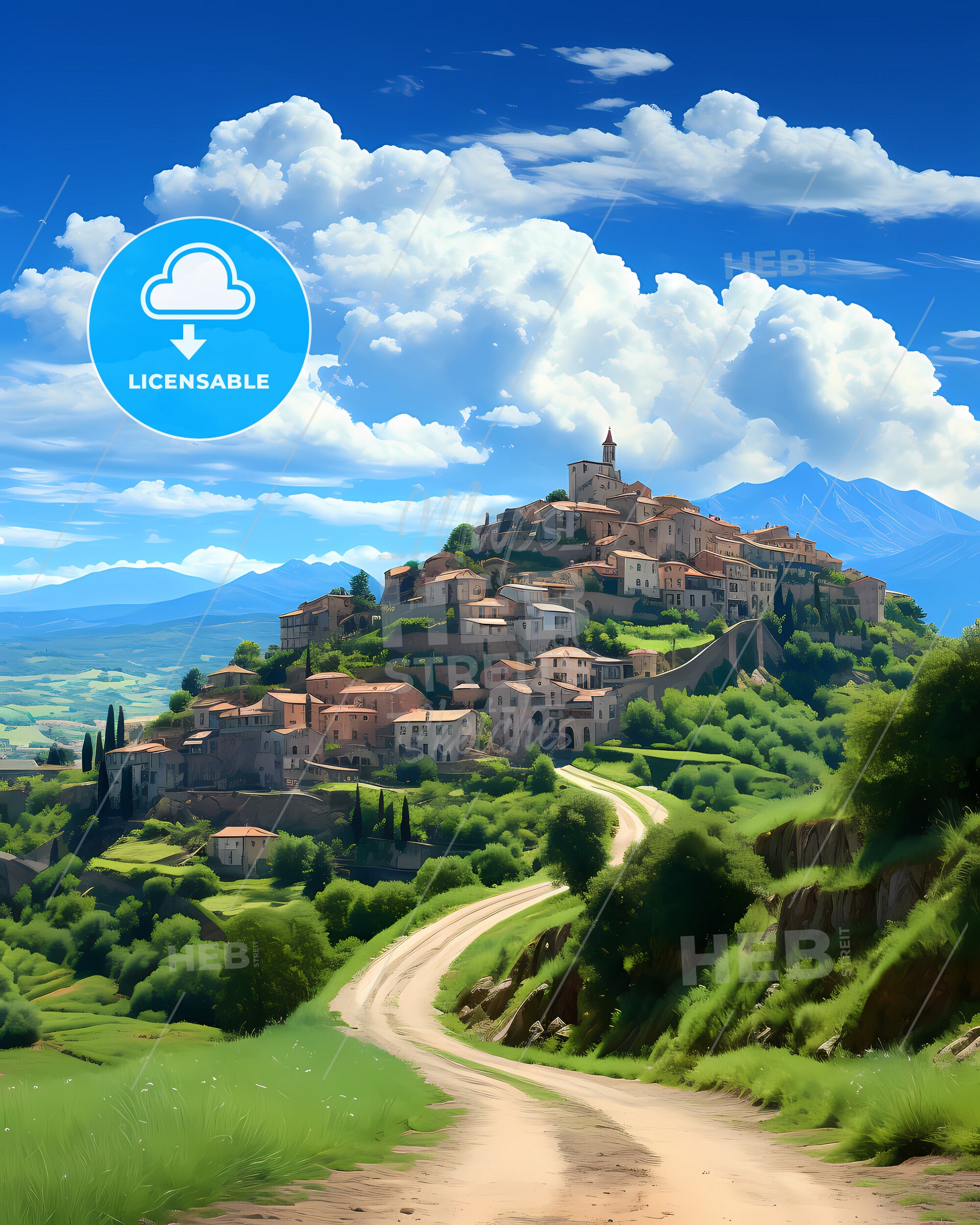 Carrara, Tuscany, Italy, Skyline. art painting with blue sky some bright clouds in spring. in style of classic advertising illustration with nice gradients. Nice strokes and outlines that captures the playful spirit and vivid imagination of modern art.