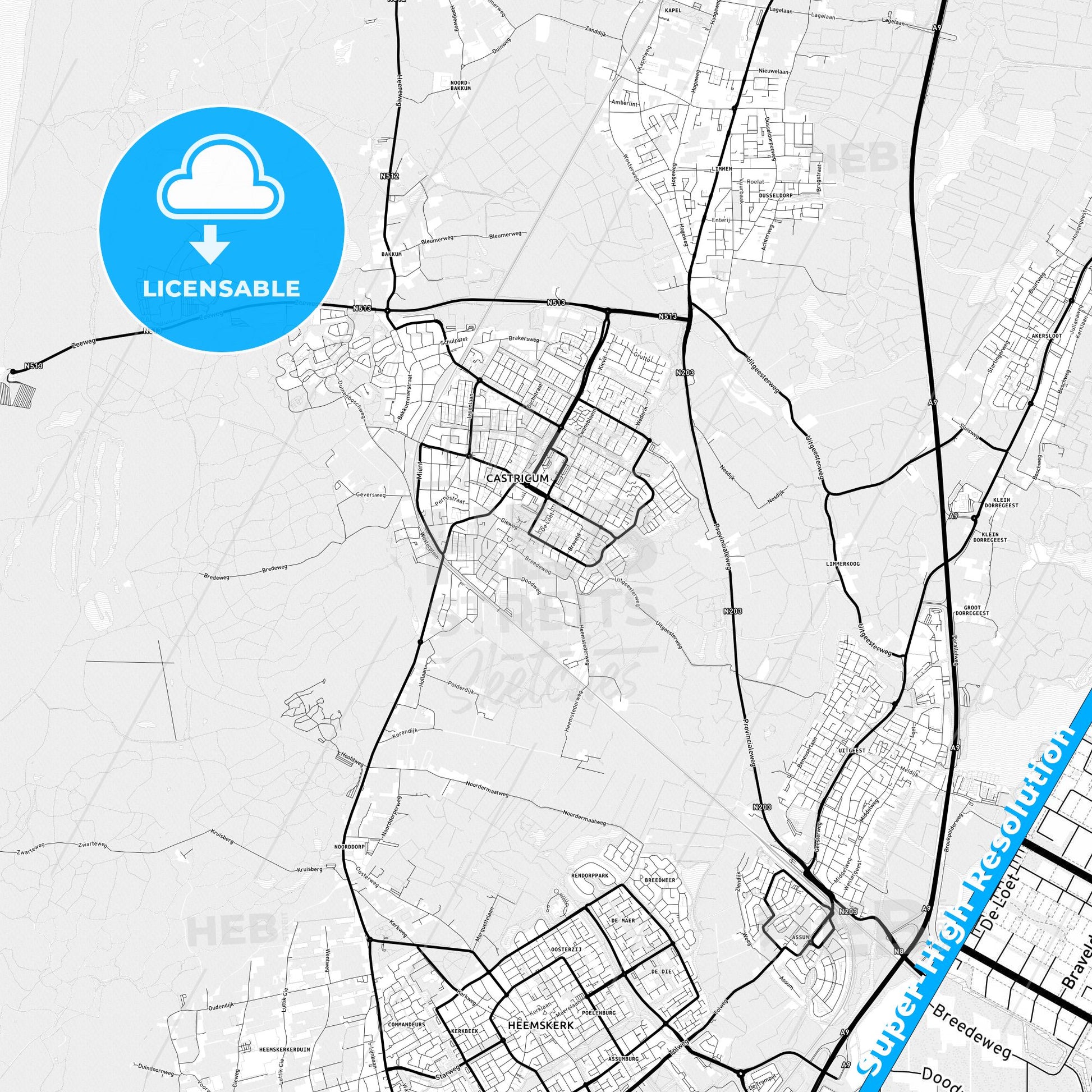 Castricum, North Holland, Netherlands in high-resolution, minimalist map designed for printed use. This detailed black and white map accurately highlights the street network and urban layout, making it an ideal ready-to-use map for your business.