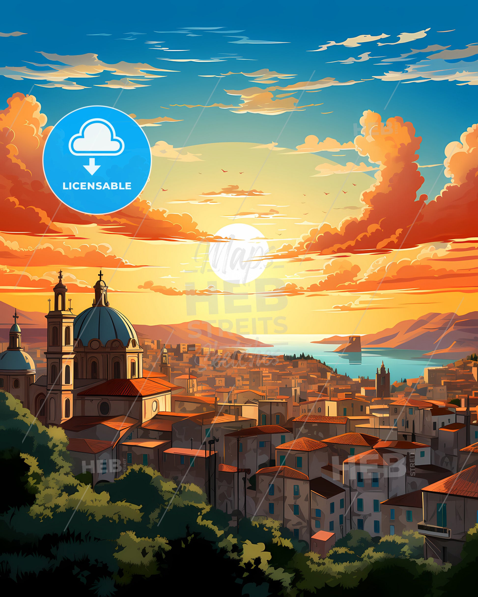 Catania, Sicily, Italy, Skyline. art painting with blue sky some bright clouds in spring. in style of classic advertising illustration with nice gradients. Nice strokes and outlines that captures the playful spirit and vivid imagination of modern art.