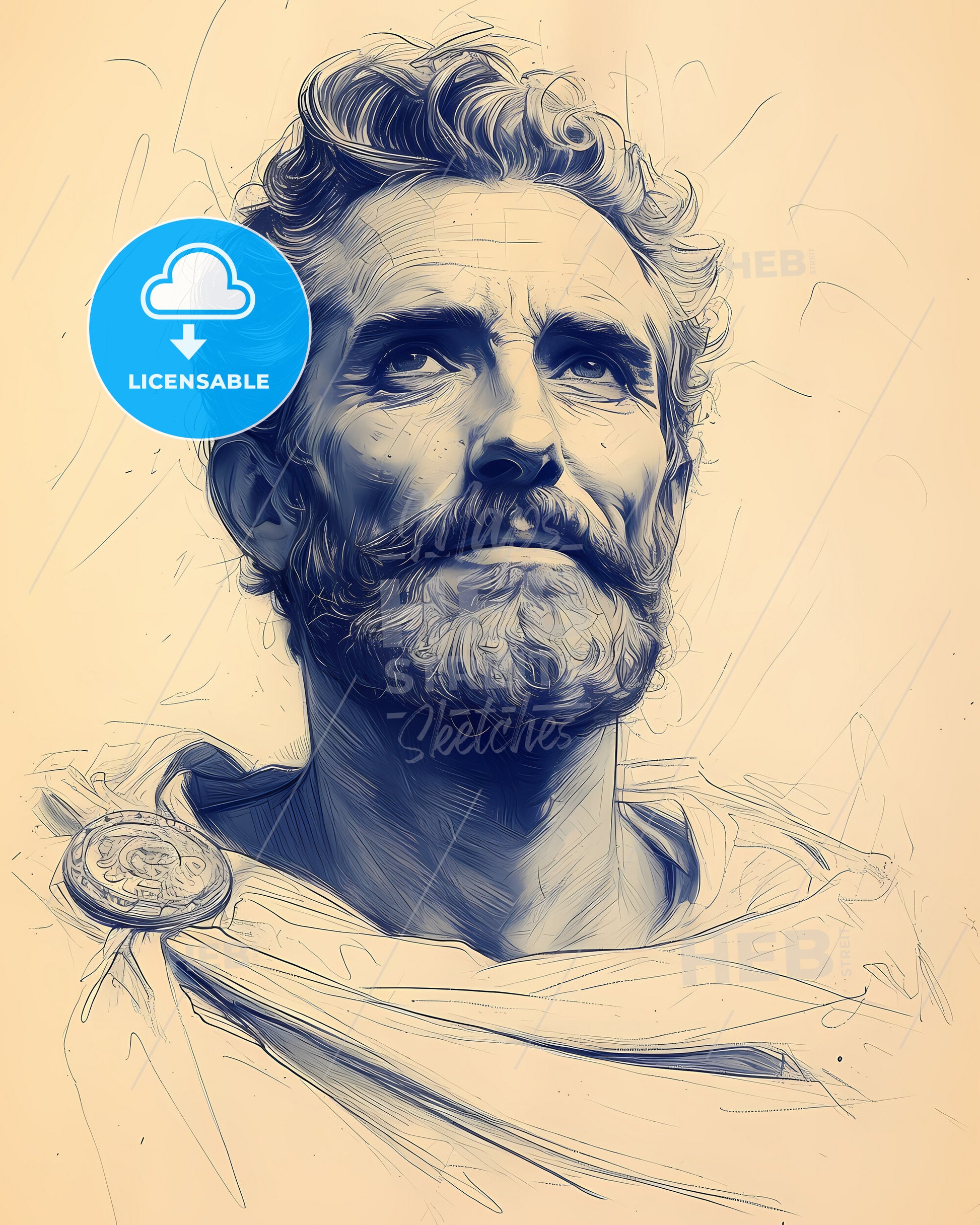 Portrait of Charlemagne, c. 742 - 814, Holy Roman Emperor, Founder of the Carolingian Empire, known for his efforts to unite Western Europe and his patronage of the Carolingian Renaissance. smiling. Vintage art illustration on bright beige paper background - historic art style, sweeping overdrawn lines, subtile colored artwork, that captures the playful spirit and vivid imagination of modern art.