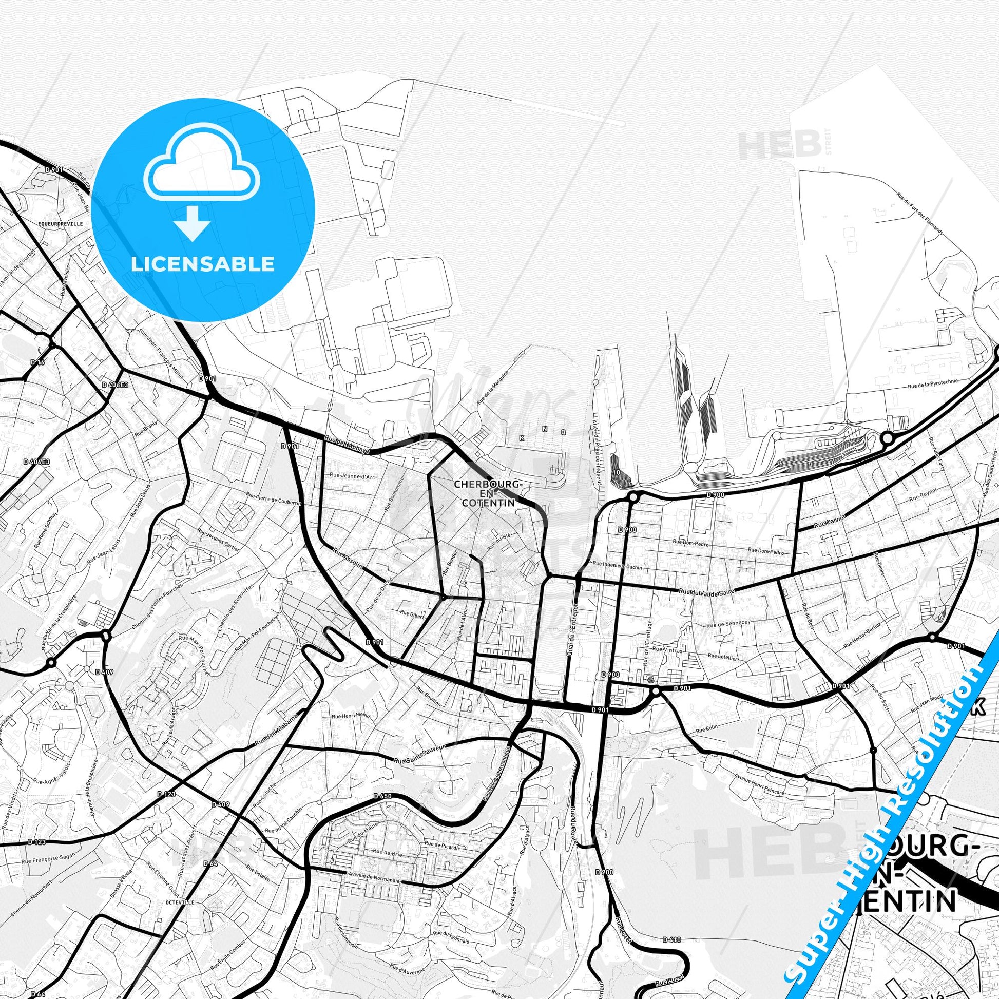 Cherbourg-Octeville, Manche, France in high-resolution, minimalist map designed for printed use. This detailed black and white map accurately highlights the street network and urban layout, making it an ideal ready-to-use map for your business.