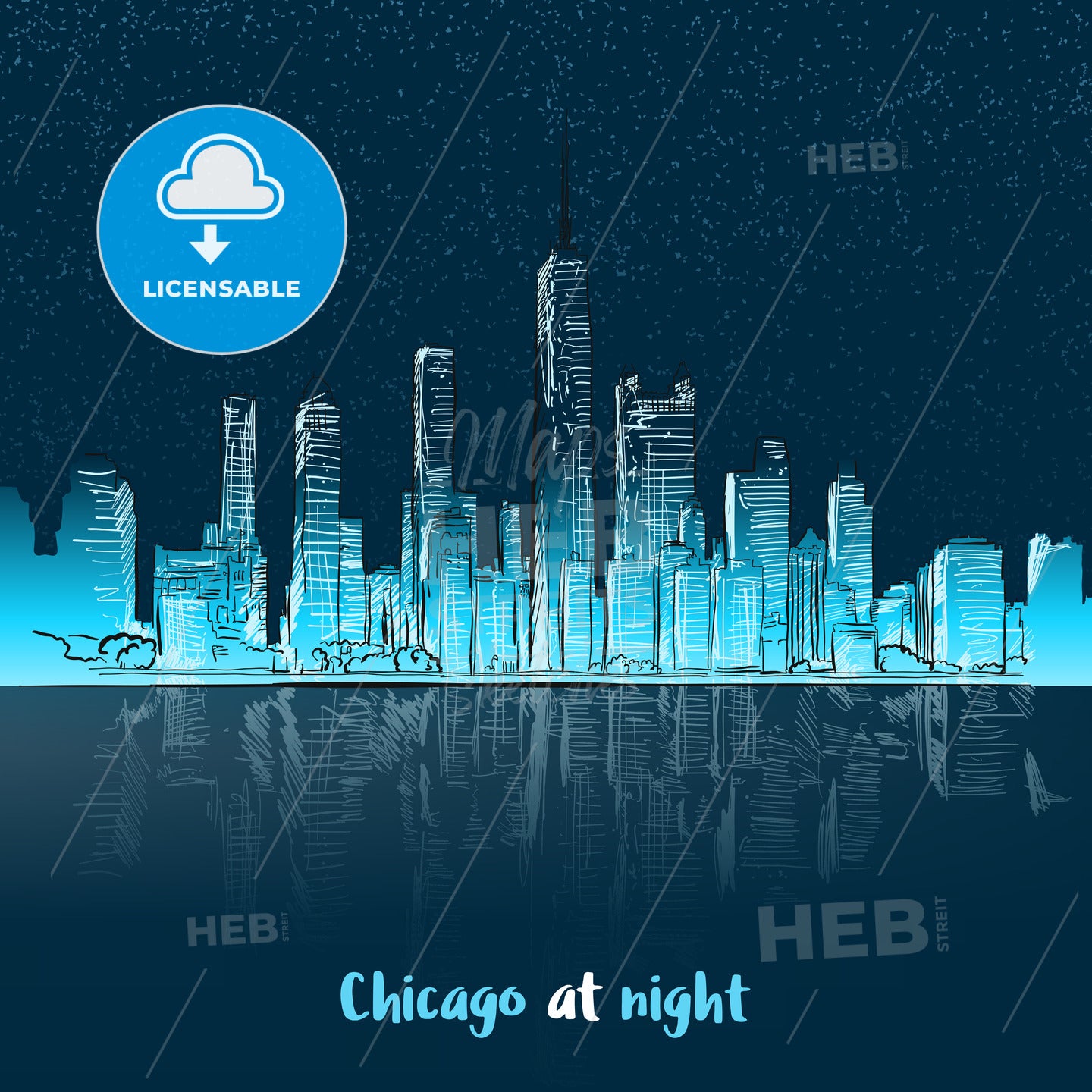 Chicago at night seen from lake, hand-drawn Panorama Vector Outline Sketch