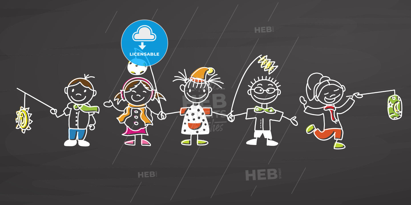 Children celebrate St Martin Day, handdrawn vector sketch, clean outlines, vintage style blackboard.
